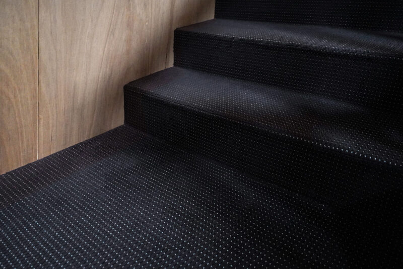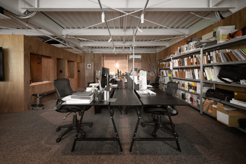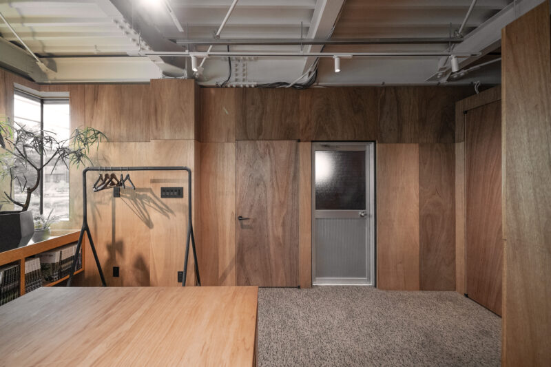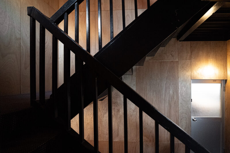 床は絨毯仕上げで階段室とオフィスで柄を変えている。このセレクトはどちらかというとラワンの壁が引き立つ(邪魔しない)もの、という観点から選んだ。階段室はブラックトーンで照明もわずかな明るさのため暗い印象だが、これもまた1950年台に見られた建築にありがちではないだろうか?そんなところまでリスペクトしなくてもと思われるかもしれないが、私はこういった空間の浮き沈みがある方が好きだ。誰かが意図したわけでもなく、誰かにフィットする心地よさというのが建築にはあり、こういう建物は長く愛されているように思う。それが狙い通りなのかどうかは定かではないが、とにかく私は薄暗い階段室のドアから広がる部屋を想像し期待を膨らます。その一歩手前のこの空間が好きなのだ。