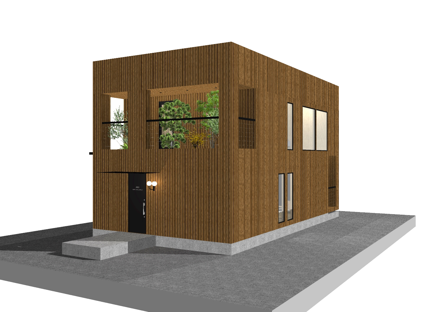✔️ 天然木の外壁を用いながらも、モダンなライン構成によって端正な外観に仕上げている