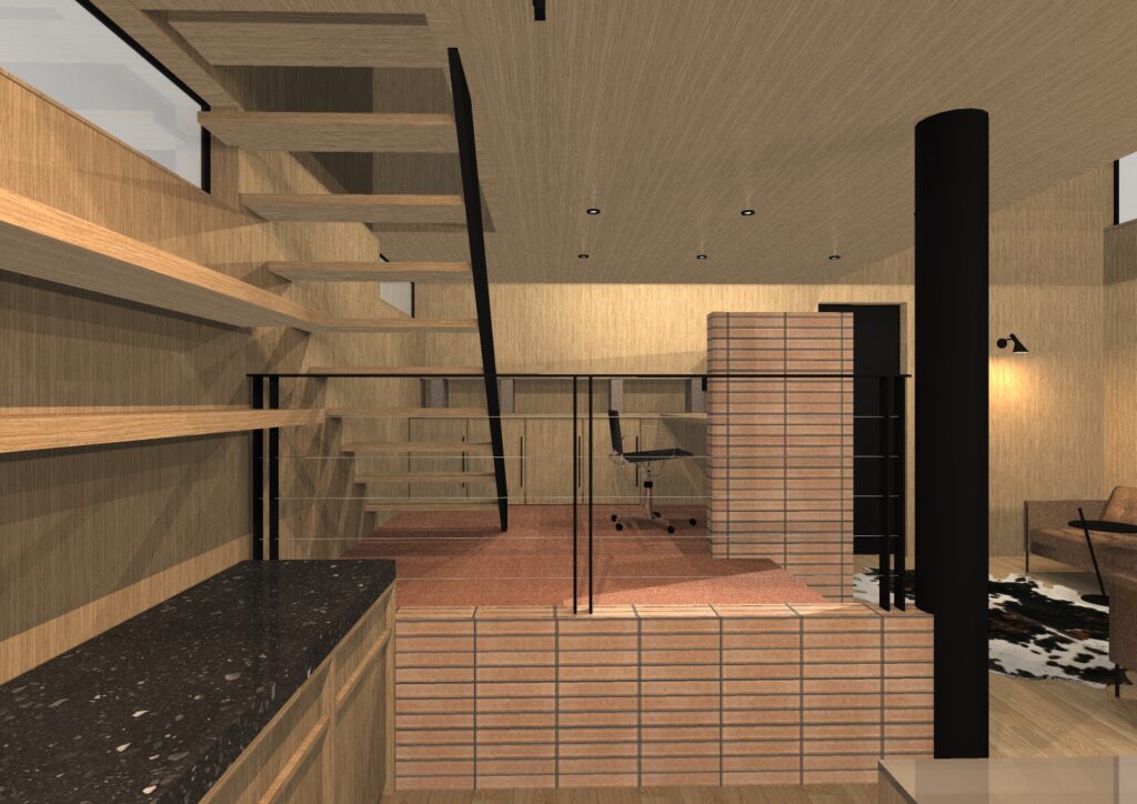 ✔️ LDKの一角に設えたワークスペースは、空間を遮らずに集中できる場を確保