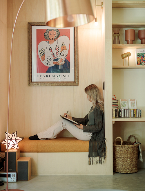 リビングの一角には小さなベンチをしつらえてくつろげるヌックに。