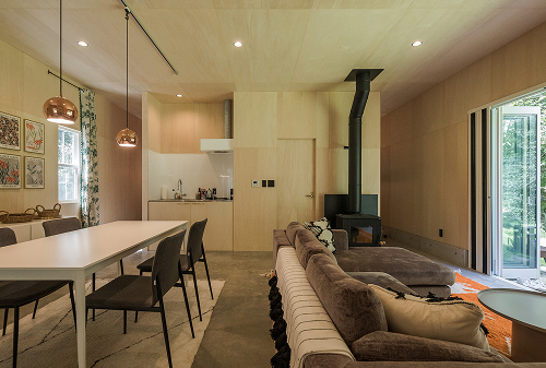 竹内さんは置く予定の家具や好みのテイストをヒアリングしたうえで、壁と天井に木目の端正なシナ合板、床はインダストリアルな表情のコンクリートを提案。モダンな家具を引き立てる背景となると共に、木の素材感を適度に取り入れて周囲の自然に調和させました。住宅はもちろん、多種多様な店舗デザインを手掛け、素材という豊かな言語をもつブラックペッパーの哲学が表れています。
