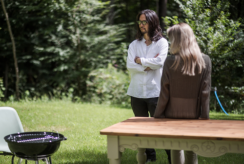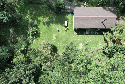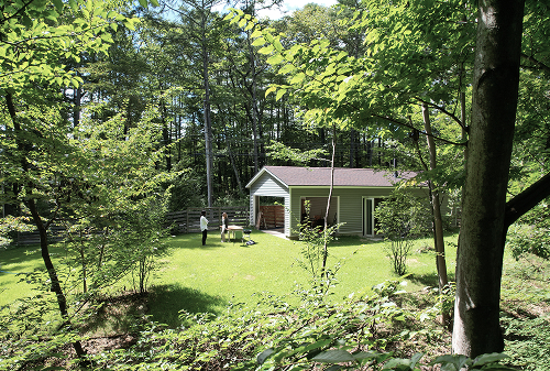 山梨県北杜市に立つ、Sさんご家族の週末住宅。背の高い木々に囲まれ、視線を気にせず広い庭で愛犬と遊べる。