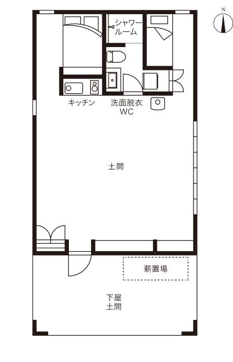 正面左手がキッチン、右手がシャワールームへの扉。左奥に進むとベッドスペース。ご夫妻の希望で入れた薪ストーブが住まい全体を温める。土間には蓄熱効果も。
