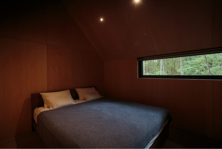2階の寝室はスリット窓で光を絞り、こもるような空間に。手前にウォークイン・クローゼットがある。