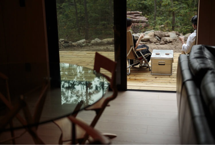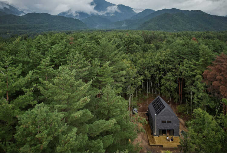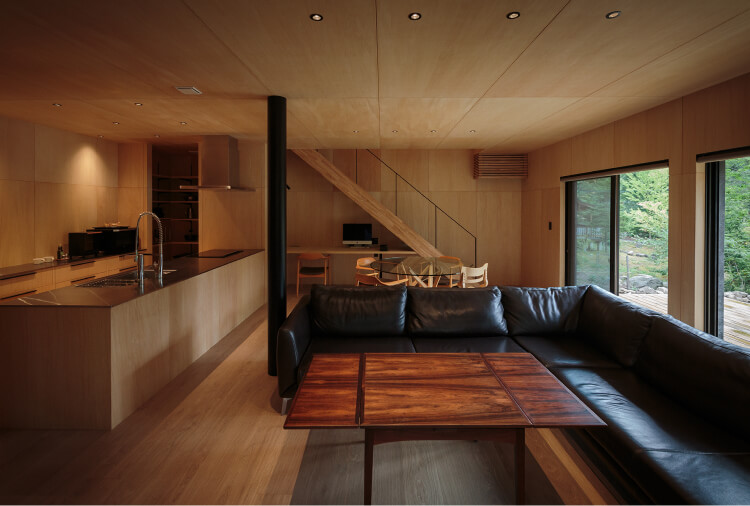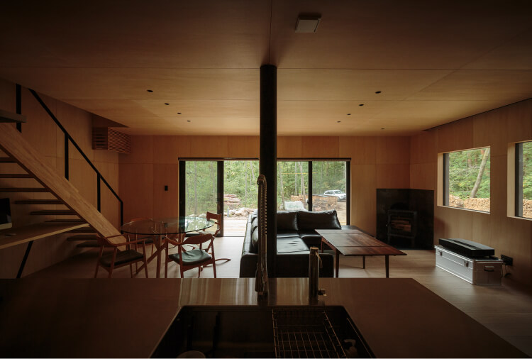 みずみずしい安曇野の森とコントラストを描くモノトーンの切り妻屋根。扉を開けると、木の色とブラックが織りなすミッドセンチュリーを思わせるモダンな空間と、大きな窓が切り取る森の景色に迎えられます。