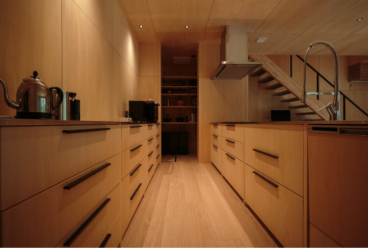 空間で印象的なのが素材の使い方。奇をてらわず、けれど少しスパイスを効かせた素材が表情をつくります。M邸も色を抑えたプレーンな空間ながら、木、メタル、レザー、ガラスと質感豊かに織り交ぜることで洗練された雰囲気に。壁と天井には、 「倉庫の雰囲気が好き」というご夫妻の言葉に着想を得て合板を使用。木目が美しいシナ合板を選ぶことで、ラフな中に端正な表情が宿っています。木の面積が広い空間は素朴な印象に寄りがちですが、階段の手すりのスチールや柱に巻いたメタル、ソファのレザーやキッチンのステンレスといった硬質な素材をバランスよくミックスし、モダンな雰囲気に仕上げました。