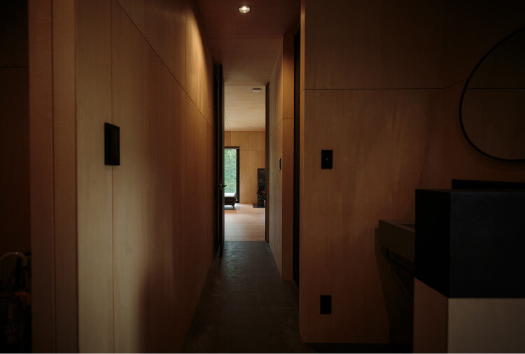 造形で追求しているのは、生かしたいラインとなくしたいラインにメリハリをつけること。窓や扉の枠を設けず壁や床とフラットに納める、巾木(床と壁の境目に付ける部材)を使わずエッジを見せる。引き算のデザインはごまかしが効かないためディテールまで精度が問われますが、確かな技術をもつ職人との連携により、美しさを形にしています。M邸では、合板の間の2㎜幅の目地を壁から天井まで一直線につなぐ細やかな仕事により、おおらかな空間に均整が生まれています。「物と余白の関係も大切です。以前は住まい=箱と捉え、家具や物が入って初めて空間が完成するように設計していましたが、最近は物をあまりもたないミニマルな生活を実践する方も増え、その場合は、物がなくてもシーンが成り立つよう意識して設計します」