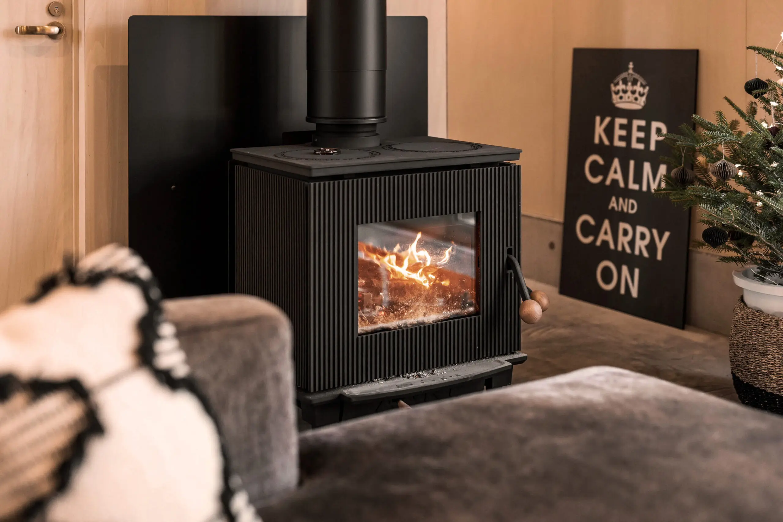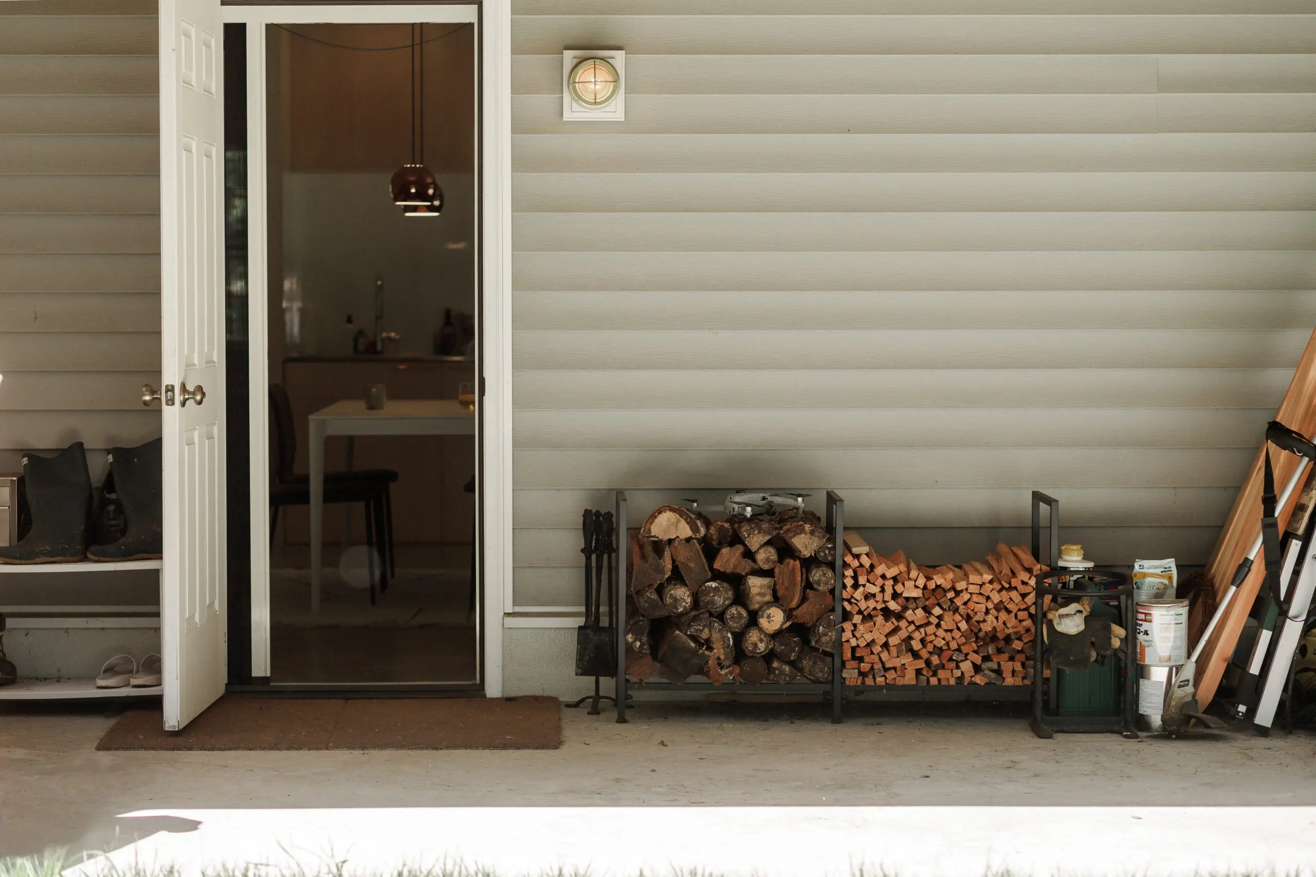オーナーが当初から希望していた薪ストーブは、仕切りのない部屋全体を温め、建物の軒が延長されたスペースには雨が降っていても体を濡らすことなく薪をとりにいける。