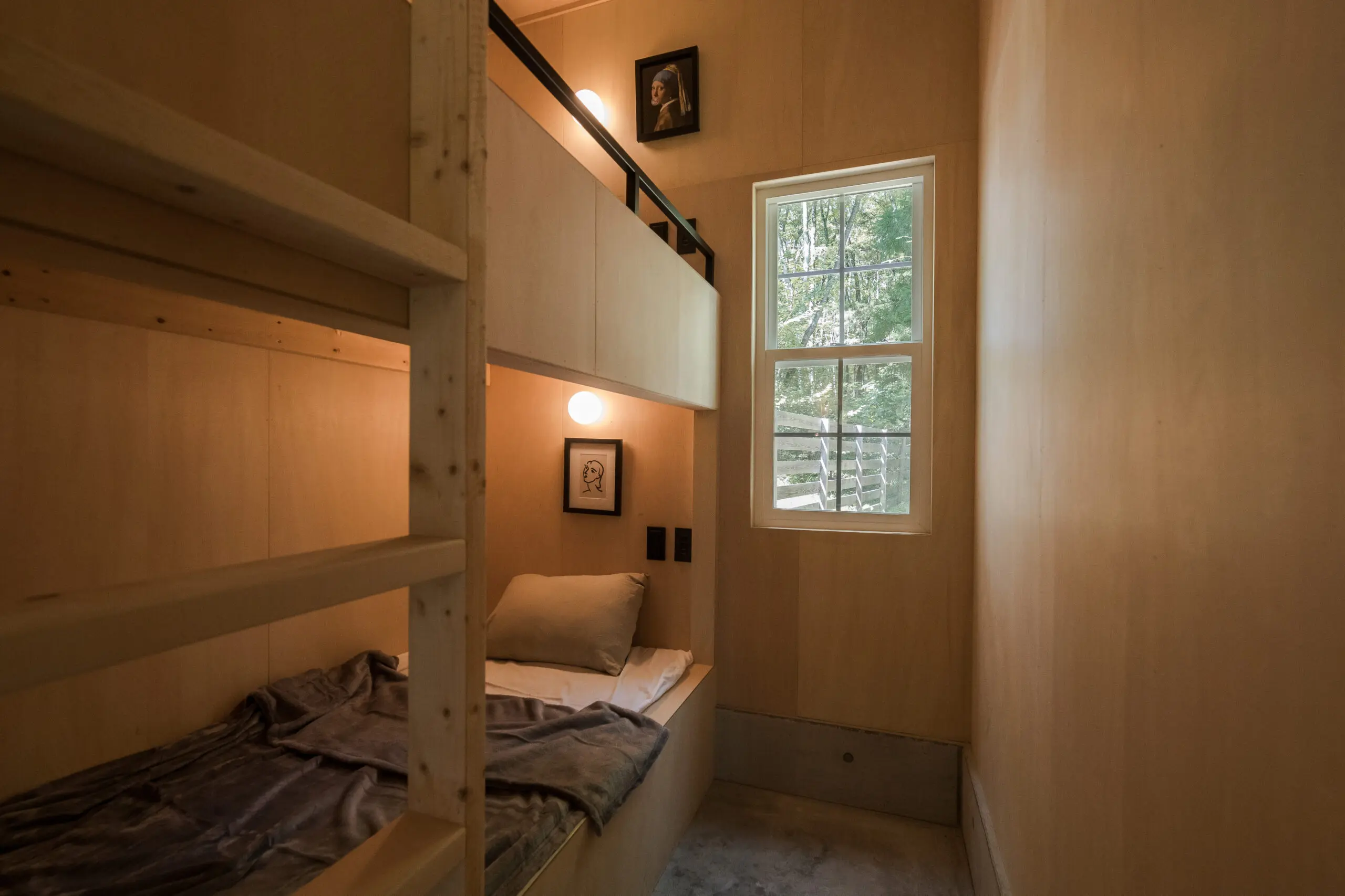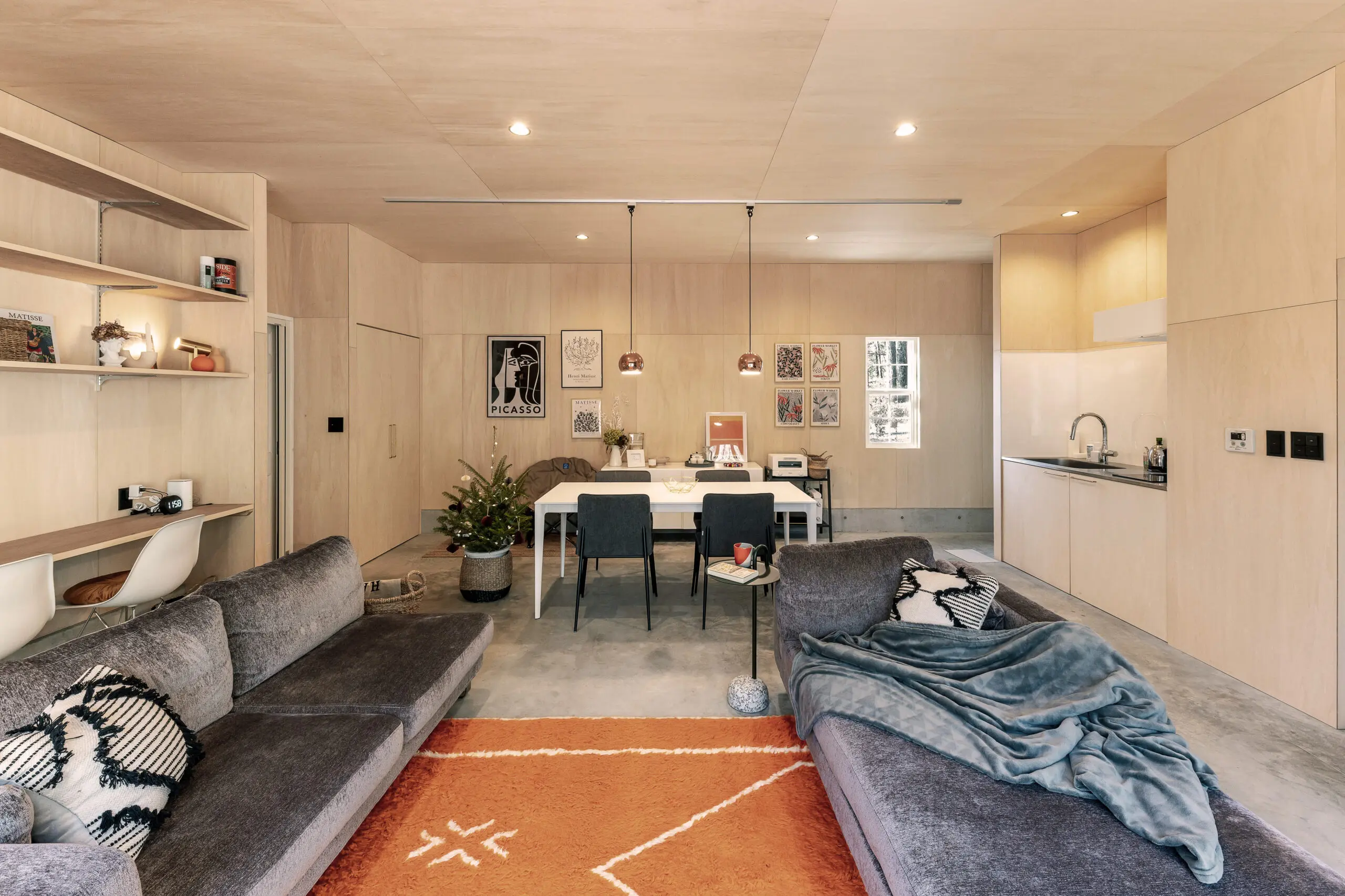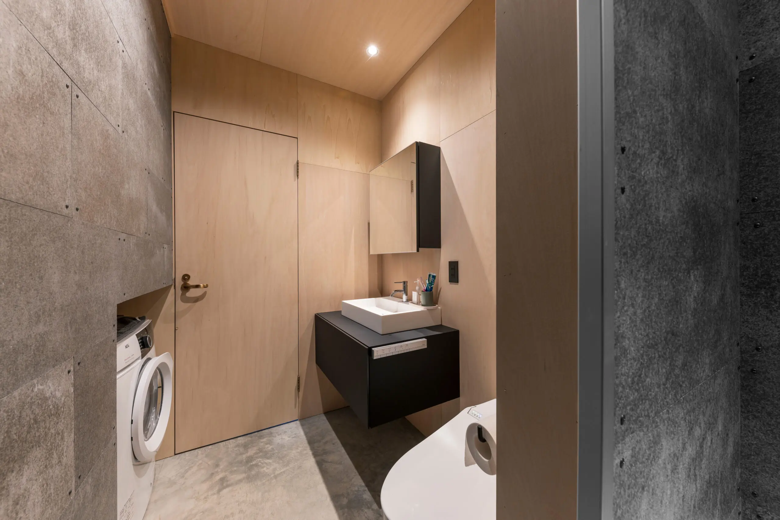 住居部分の床面積はそれほど大きくはない55㎡程だが、その大部分をLDKとし大開口の窓が、OUT・INを繋げる役目を果たしている。ガレージの特徴でもある床は、コンクリート土間打ちっぱなしを採用し、愛犬は外と中を自由に出入り可能。このサイズでも3ベッドが造作で設置され、他にもトイレ・シャワー・洗濯機も同じ所用室に完備されている。 寝室とLDKは配置的には別空間と感じられるよう配慮されているが、扉などでは仕切られていない。