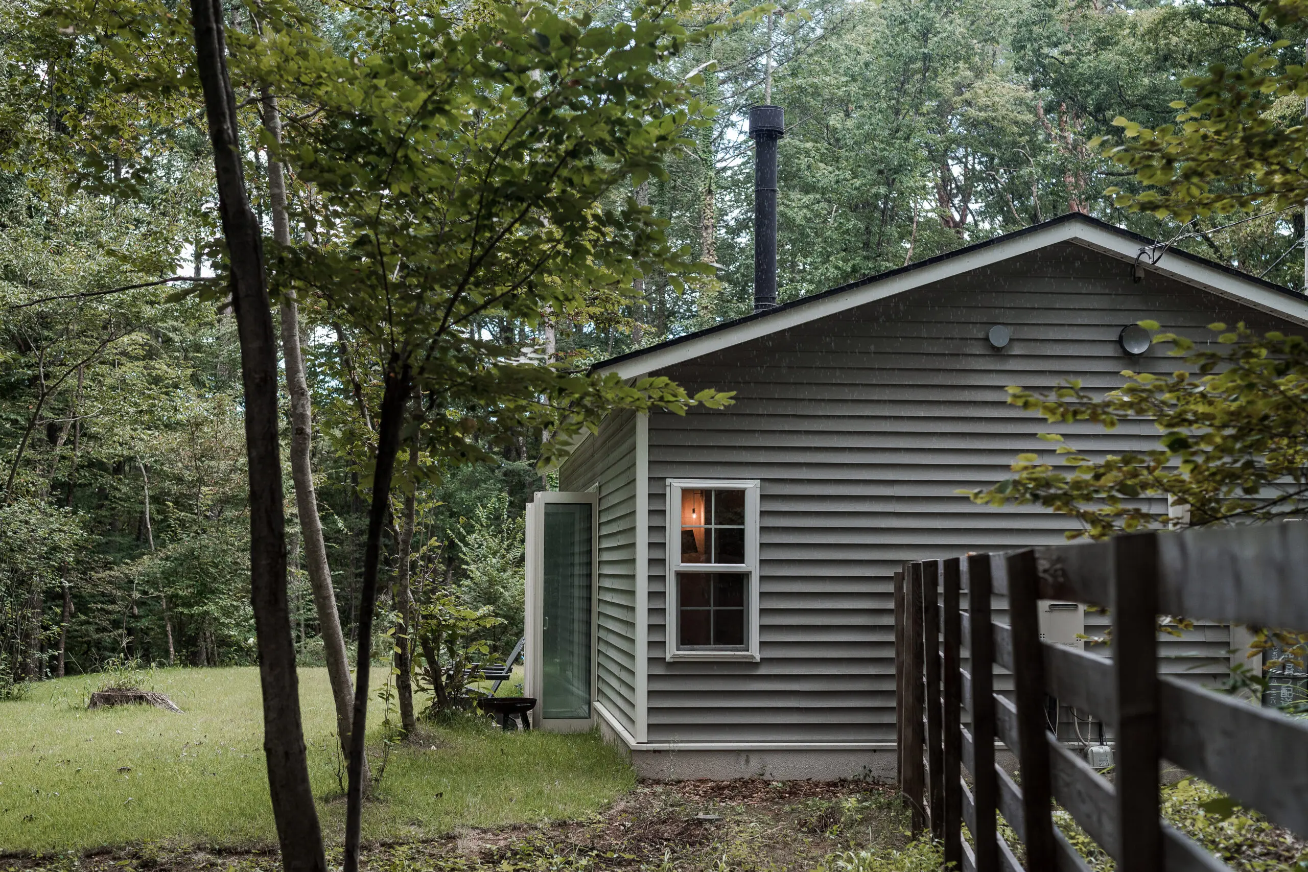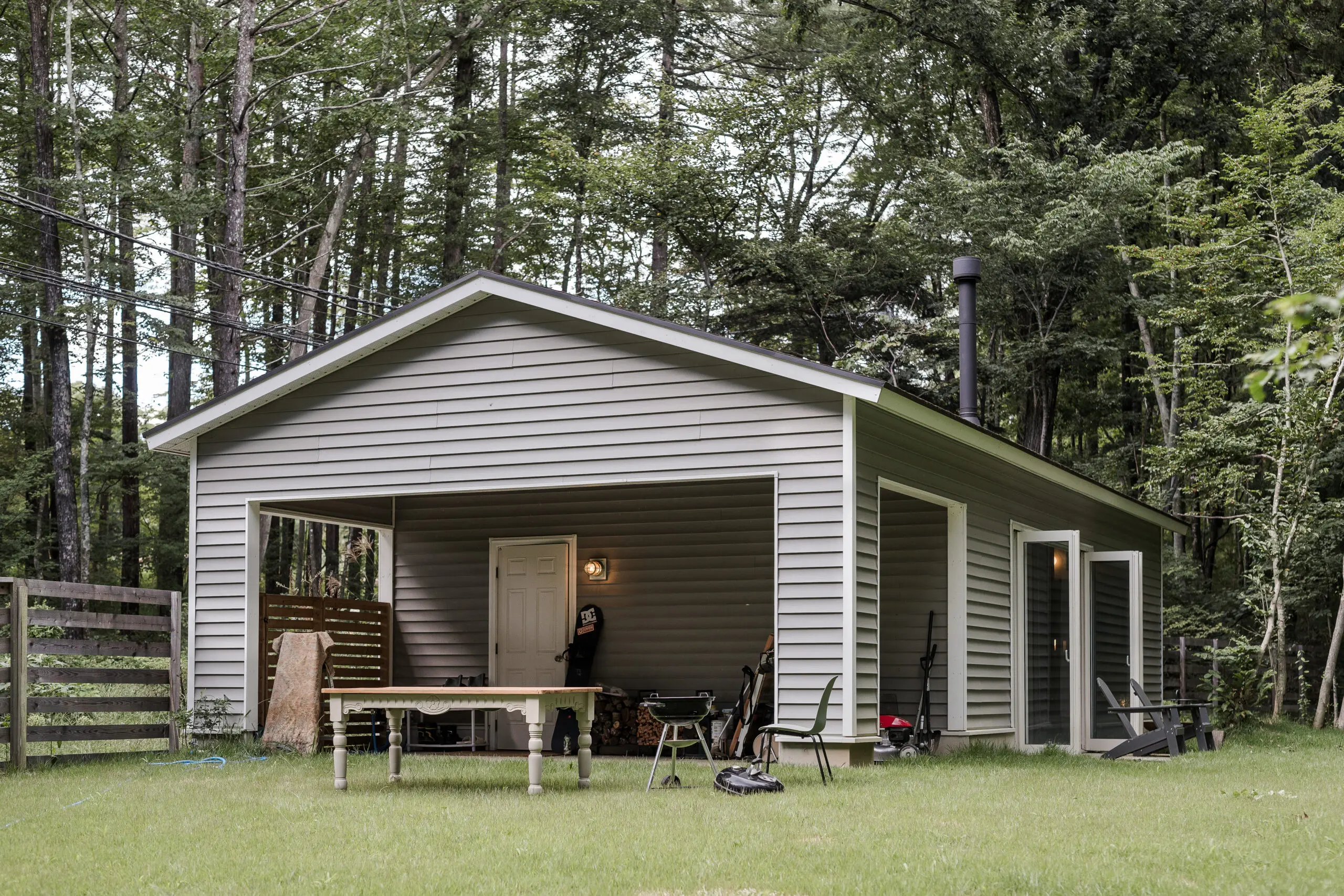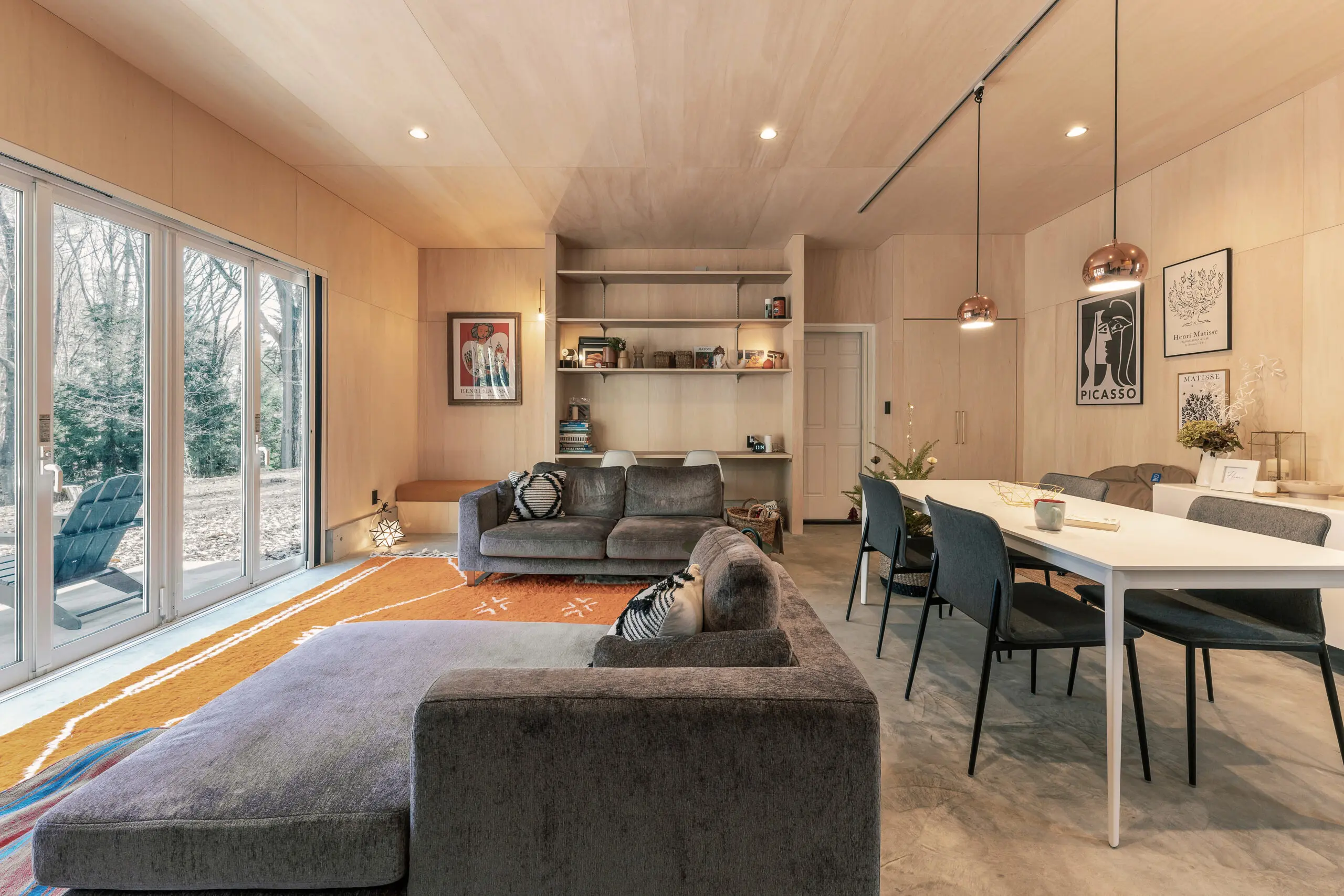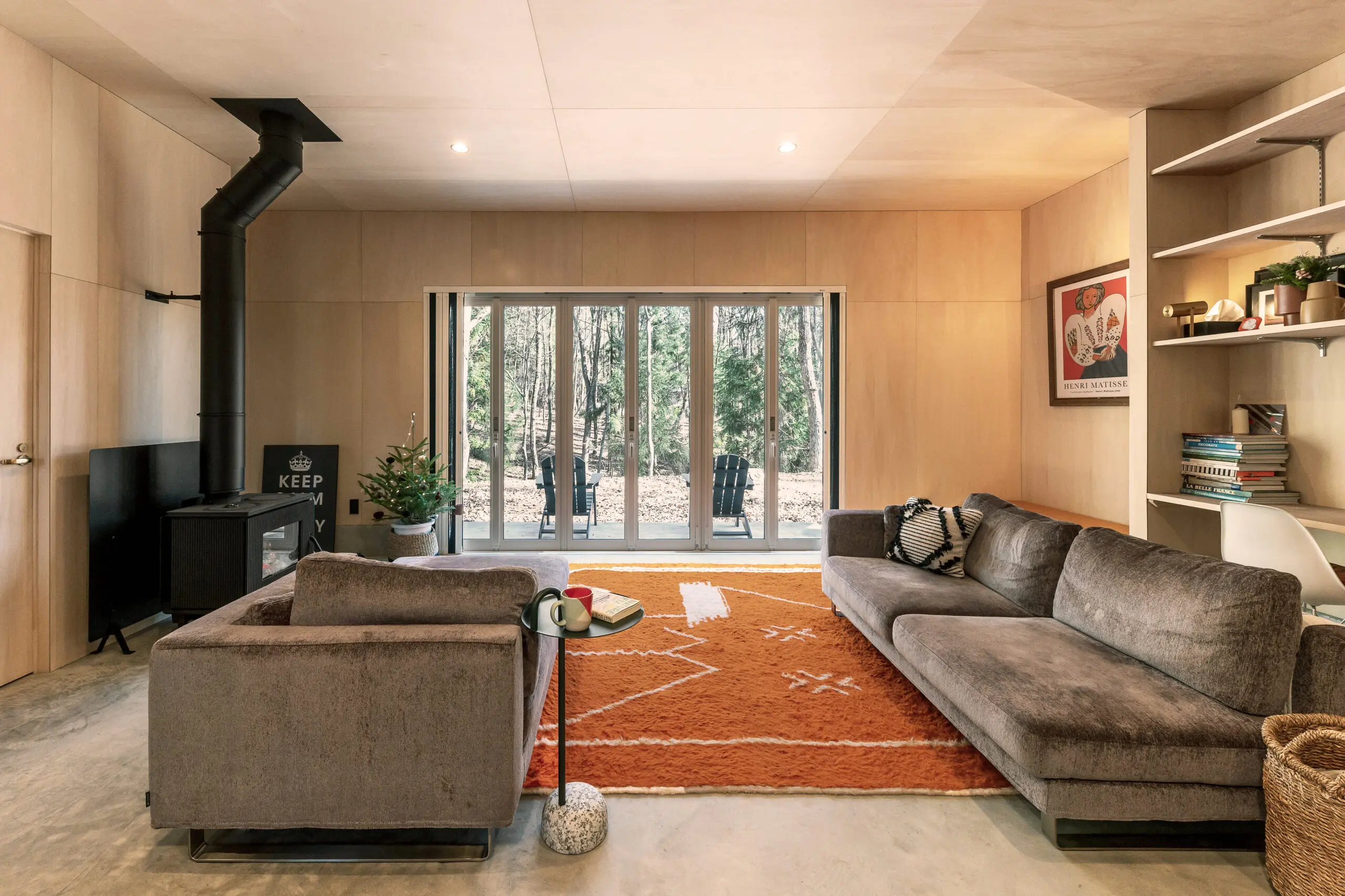 普段は関東で生活されている家族が、セカンドハウスの地として選んだのが山梨県の別荘地。大型犬を飼われていてノーリードで家族と過ごせる時間を手に入れるべく計画がスタートした。住居に求めたものメインの住まいは関東にあるため、定住は目的としない。1番の目的は愛犬とどうすれば最高の時間を過ごせるか。そのため一般住宅や別荘に比べて、何もかもをコンパクトに設計し、コストを抑え無駄を省いた家にしたかった。そんな思いの中オーナーが出した答えが「ガレージに住宅機能を少しだけ持たせる」という発想だ。