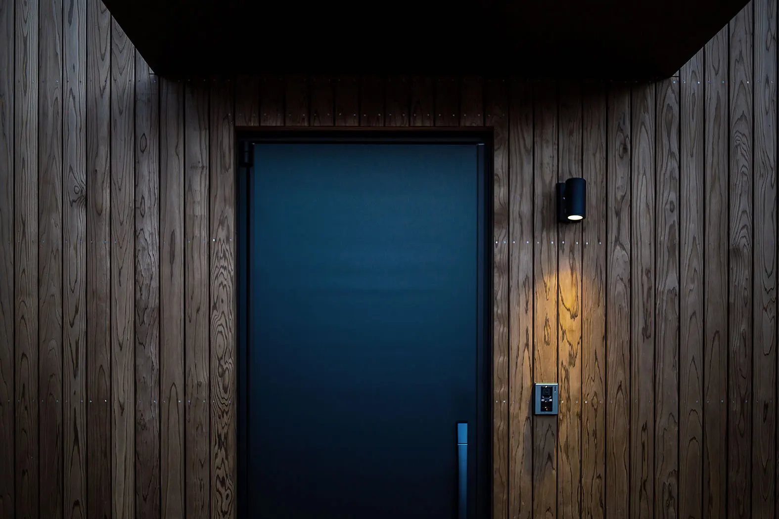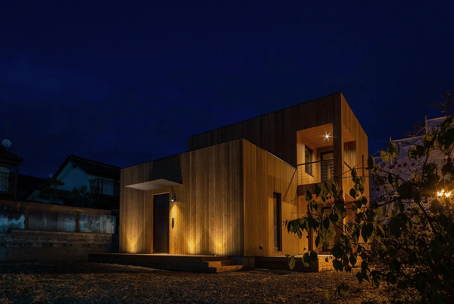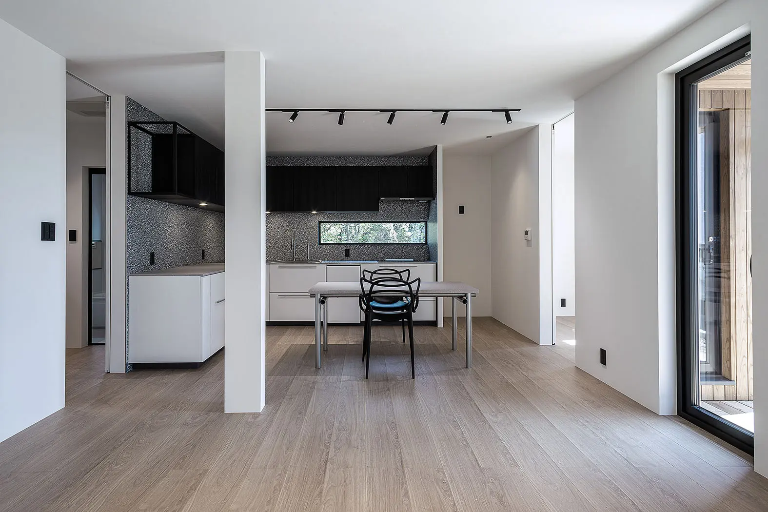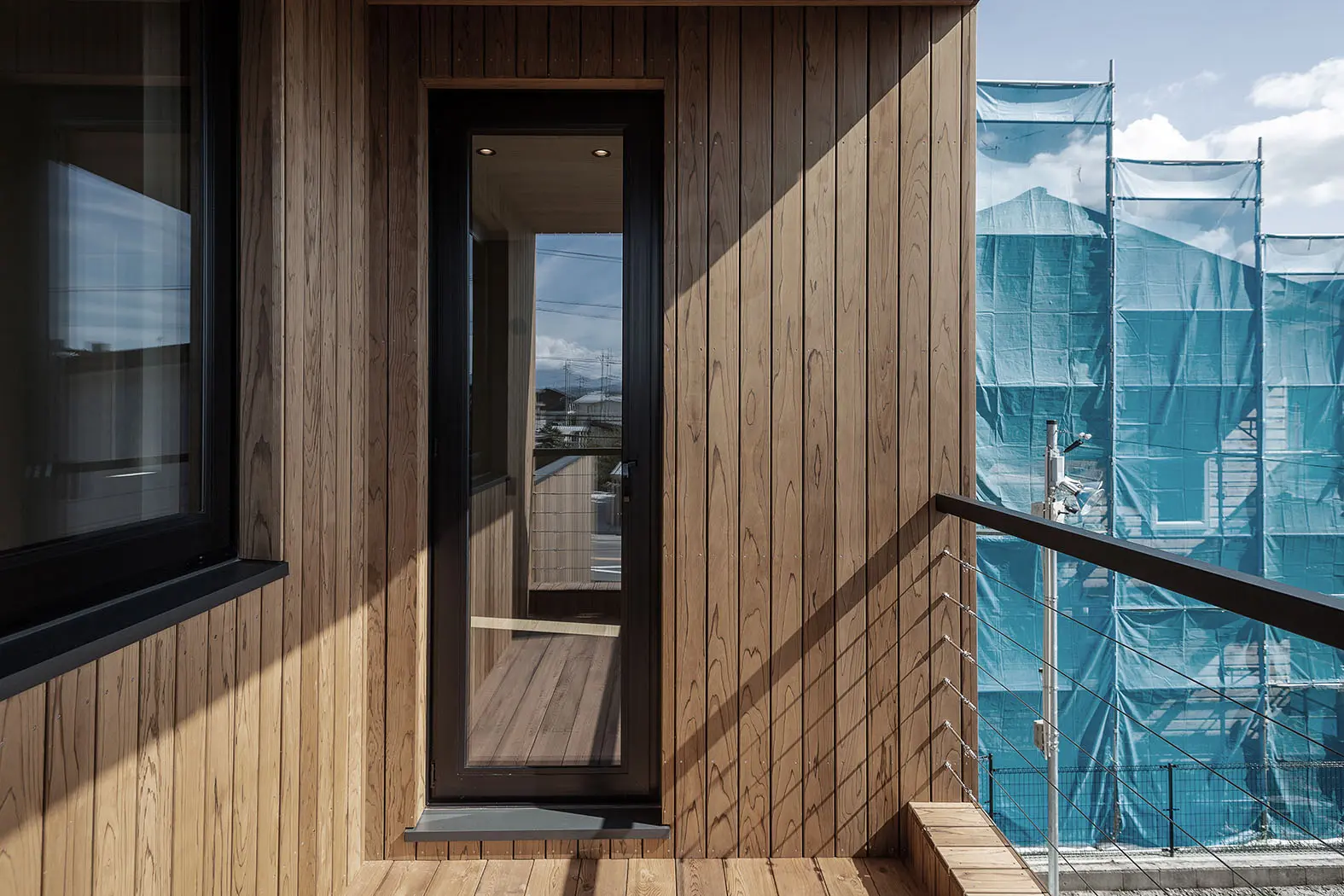 サーモウッドを使用した全面無垢材のファサードラタンの外壁が印象的な住宅。モダンなディティールとは対照的に、素材感でロケーションとの調和を取った。 サーモウッドは日光や雨風にさらされ、自然の力で徐々に表情を変化させ深みのある経年美を魅せる。室内空間はモノトーン配色のシンプルな仕上がりだが、パターンのある仕上げ材を使った造作家具が特徴。断熱性能は当社標準の210mmダブル断熱を採用し、野暮ったく見えがちなトリプル樹脂サッシもスマートに見えるよう工夫されている。