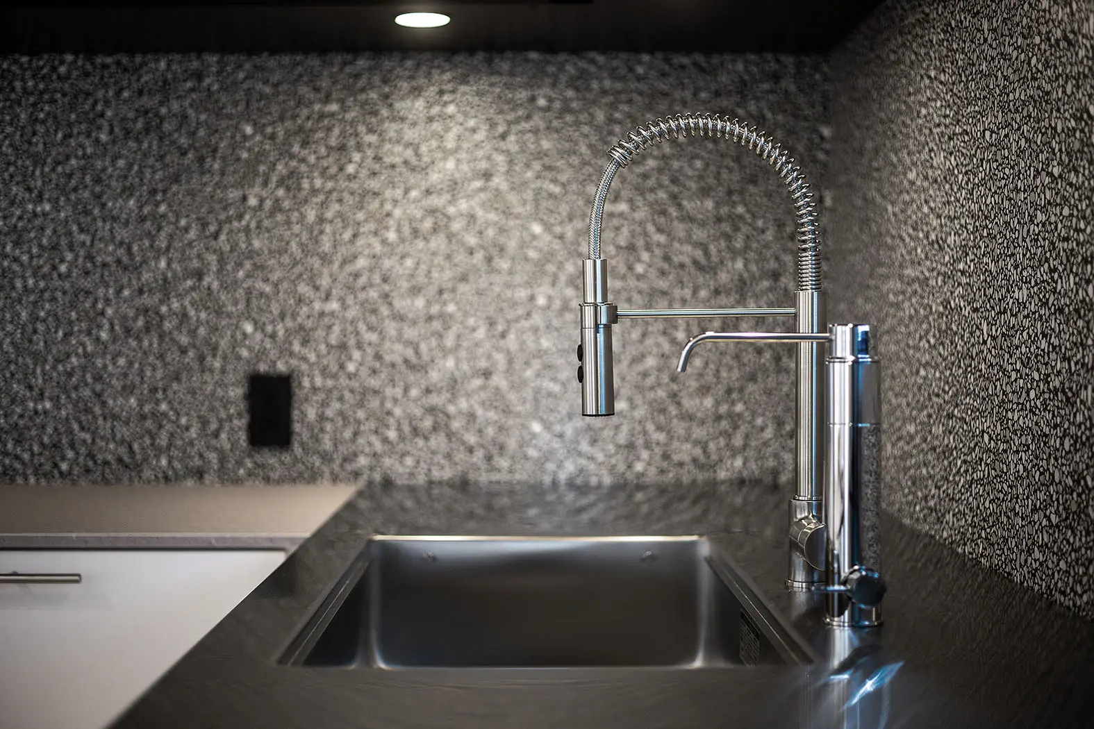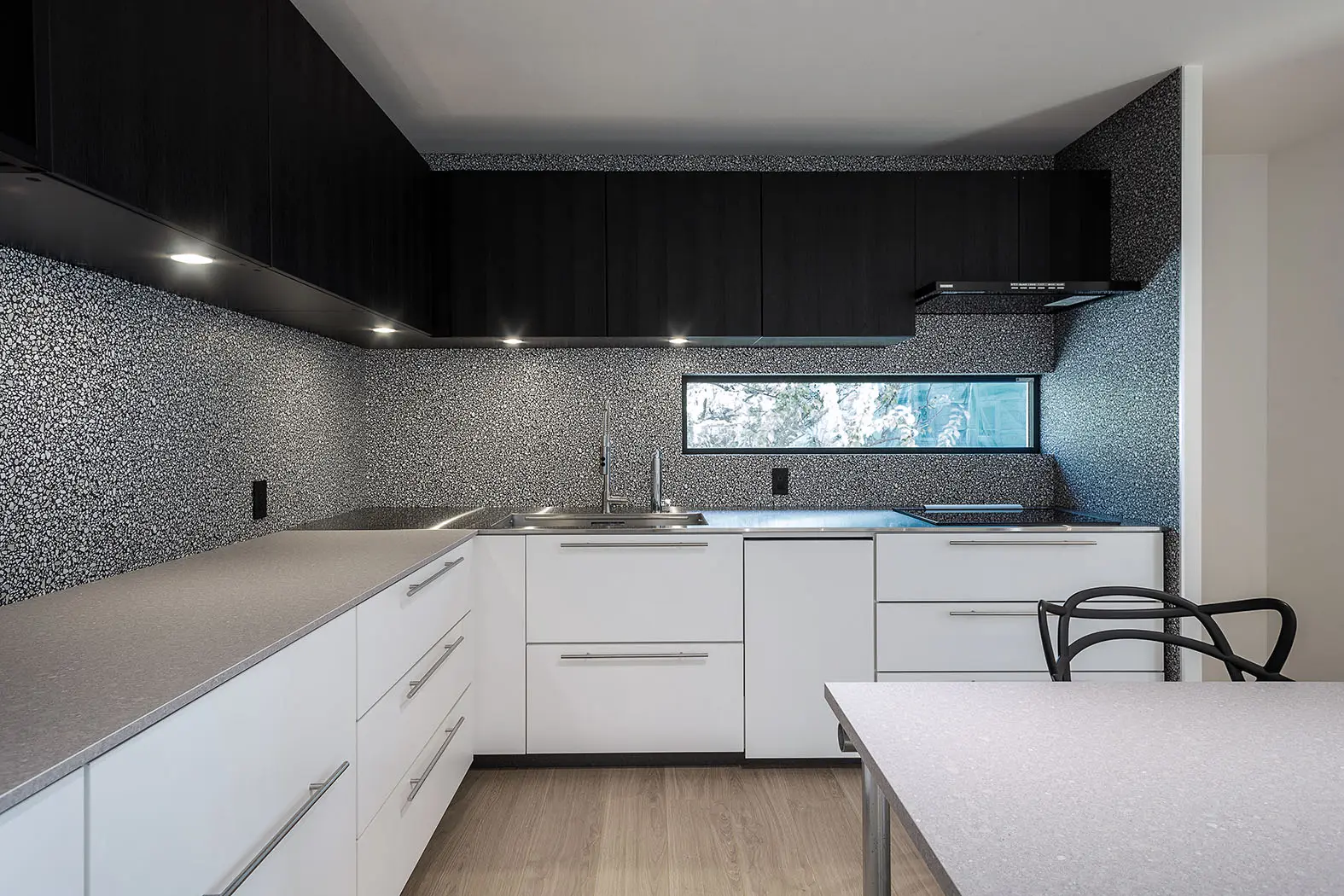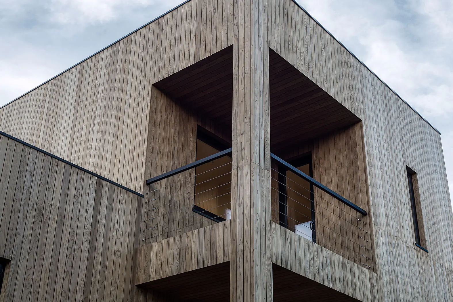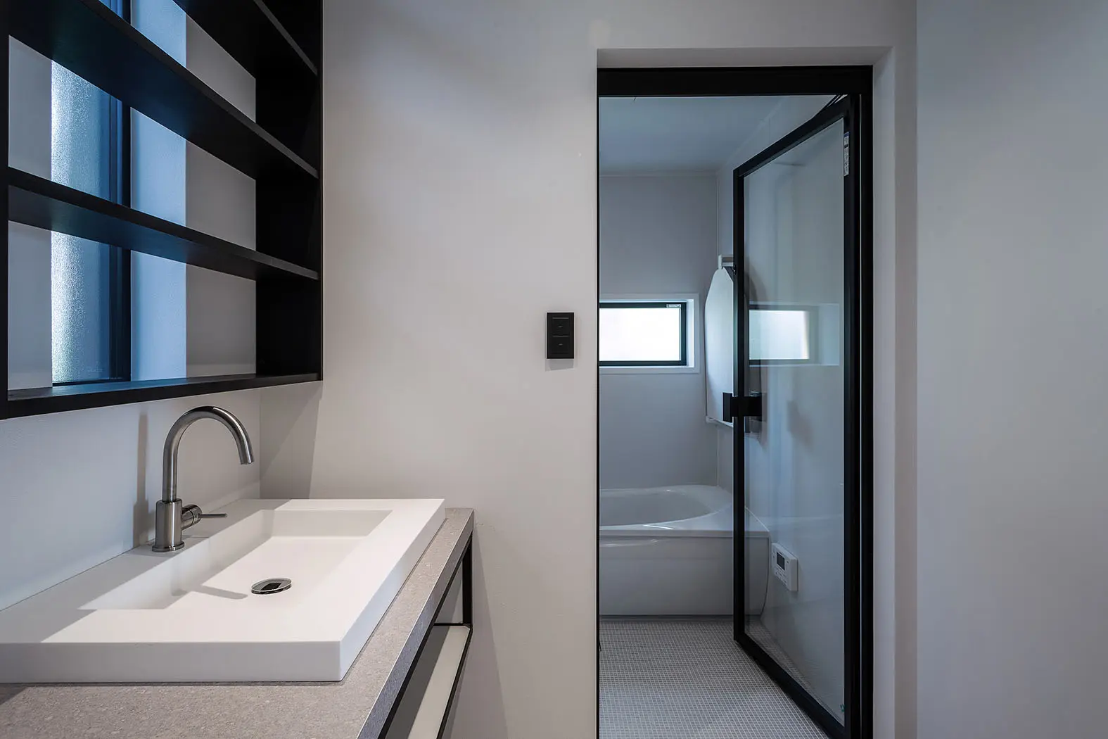 サーモウッドを使用した全面無垢材のファサードラタンの外壁が印象的な住宅。モダンなディティールとは対照的に、素材感でロケーションとの調和を取った。 サーモウッドは日光や雨風にさらされ、自然の力で徐々に表情を変化させ深みのある経年美を魅せる。室内空間はモノトーン配色のシンプルな仕上がりだが、パターンのある仕上げ材を使った造作家具が特徴。断熱性能は当社標準の210mmダブル断熱を採用し、野暮ったく見えがちなトリプル樹脂サッシもスマートに見えるよう工夫されている。
