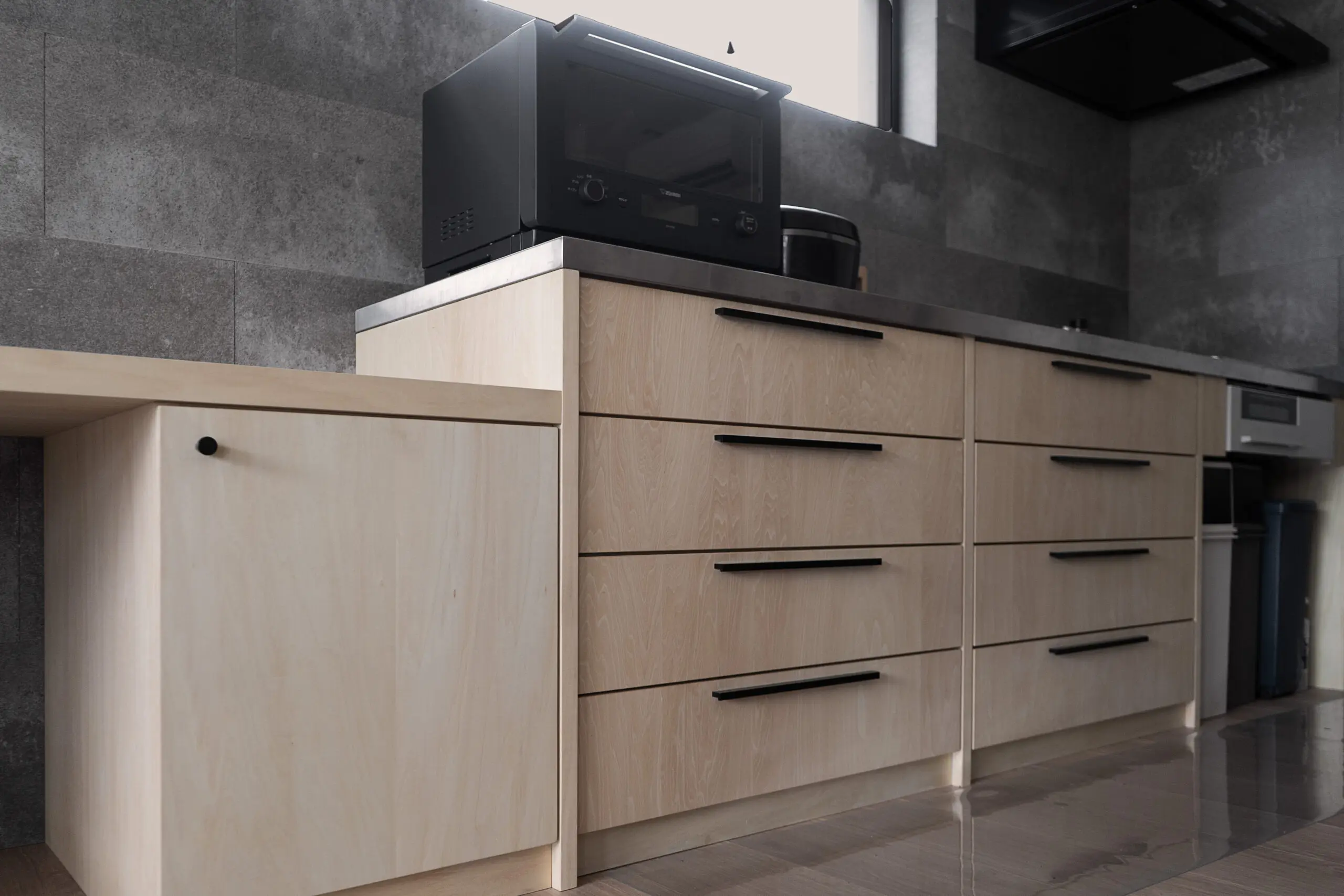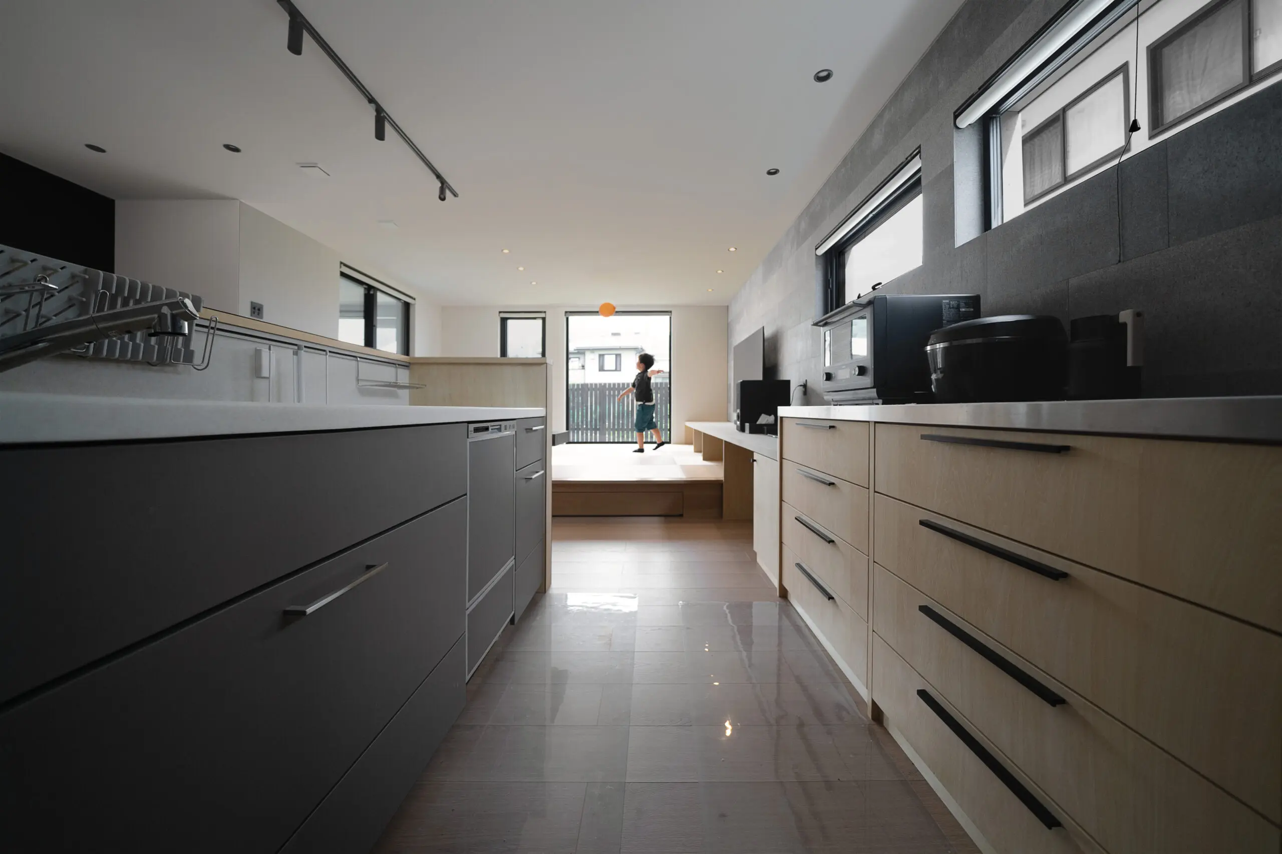 家族が集まるスペースを北側に設けることは、お施主様も頭にはあったようだが同時に不安も感じていた。3Dパースや北側リビングの資料を集め、納得してもらいながら計画を進めた。ただ私は初めからこの選択に不安はなかった。もし窓から見える景色が見たくないものであればそれほど苦痛なものはないし、大開口窓でガラス選びを慎重に行えば部屋の明るさも確保もできる。むしろパッシブハウスでない限り南面リビングにそこまでこだわる必要性を感じない。遮るのが難しい直射日光で、住環境のコントロールを難しくさせるよりも、ふんわりとした明かりが包みこむ北側空間は心地が良く、目の前に広がる庭は夏場でも子供の遊び場にぴったりだ。