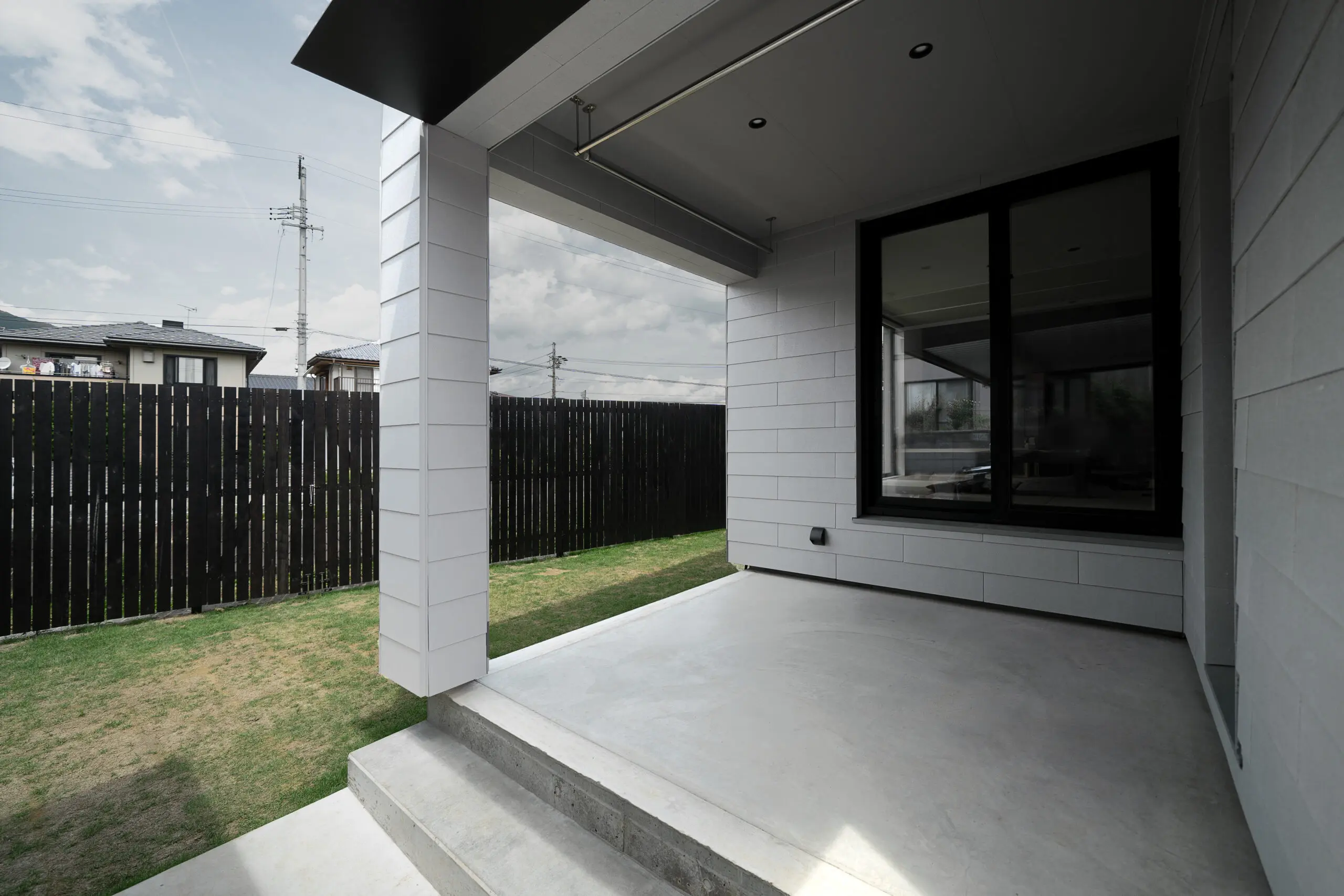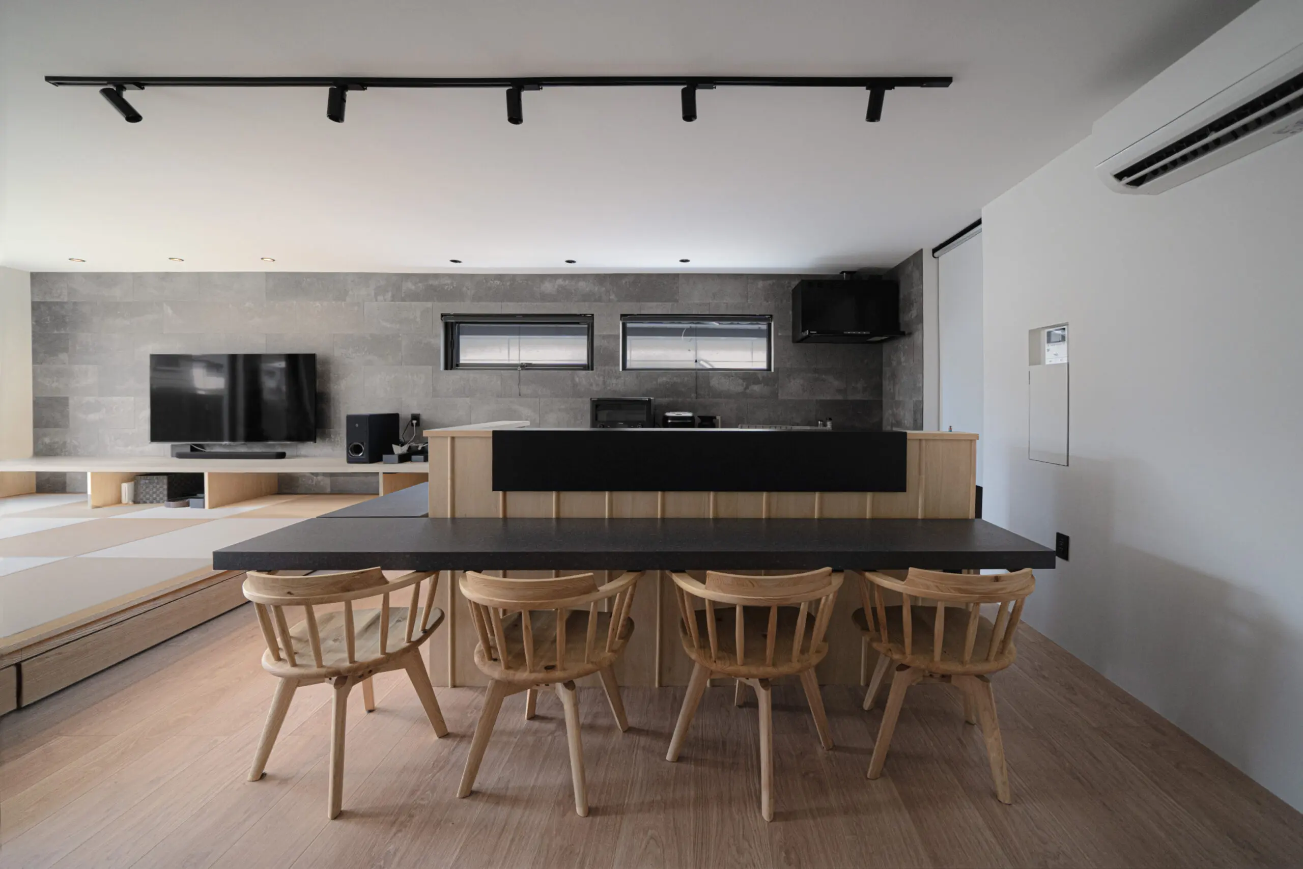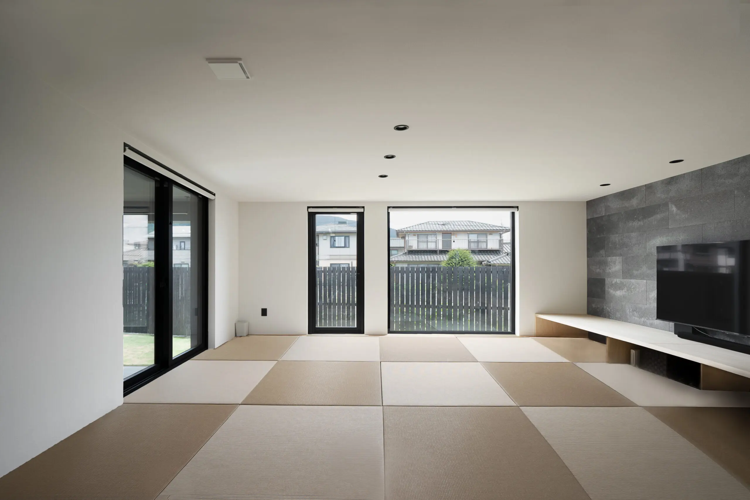 なるべく強い日陰を作らないよう、建物の大屋根は北側が水下になるよう片流れ屋根に。建物の配置も道路からのセットバックを短くし、なるべく北側に広く外からの目線を感じないプライベート空間を確保。北側リビングに隣接しテラスも設けた。日光を浴びて疲れた子供達が、川のせせらぎを感じながら屋根の下でひと休みする姿が想像できる。LDKのリビング部は一面を畳仕上げとし、段差もつけた。シンプルな空間にメリハリが生まれ、座卓を囲む姿がどこか懐かしさを感じさせる。床から天井まである窓からは、山々の季節の移り変わりを感じられ、目の前の庭で遊ぶ子供達を眺めながらリビングでくつろぐ時間は、この家族のライフスタイルには欠かせない要素と考えた。