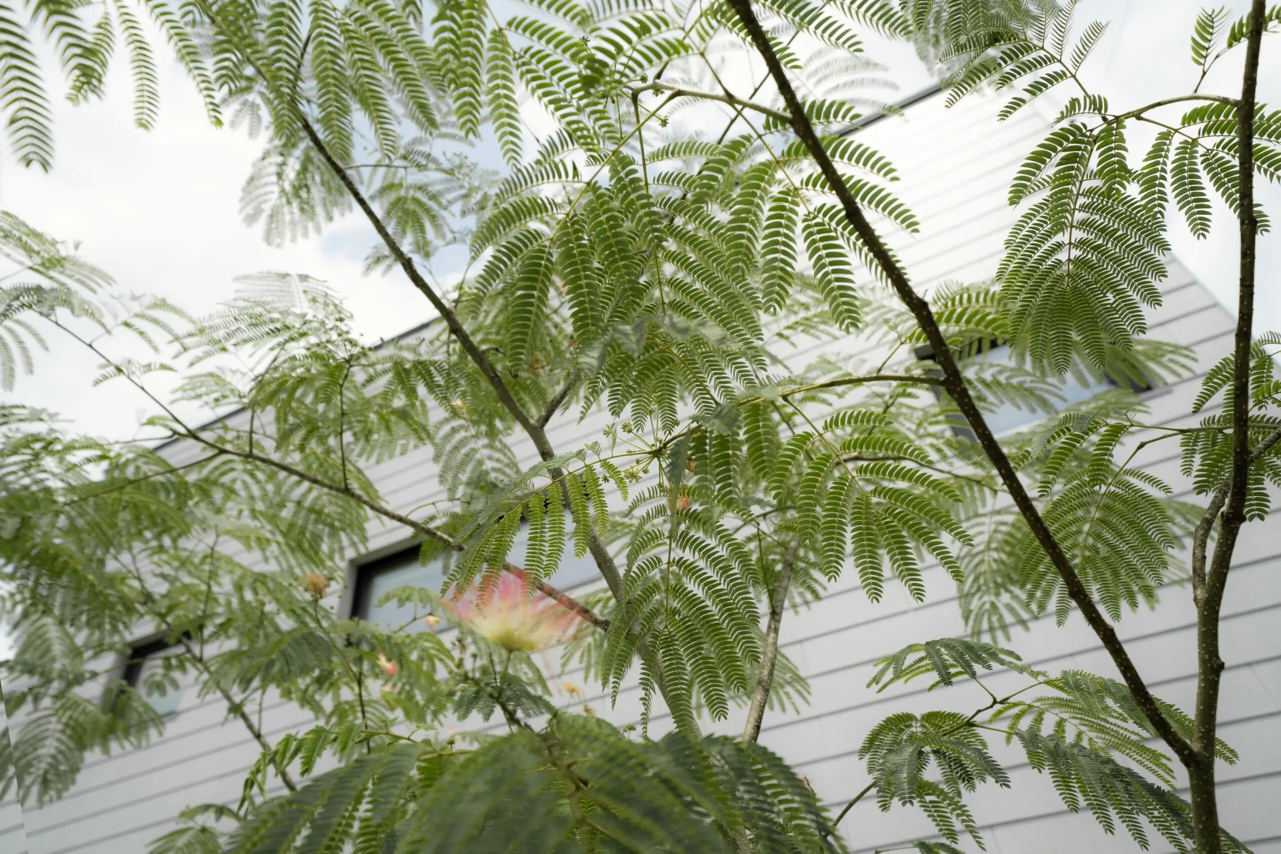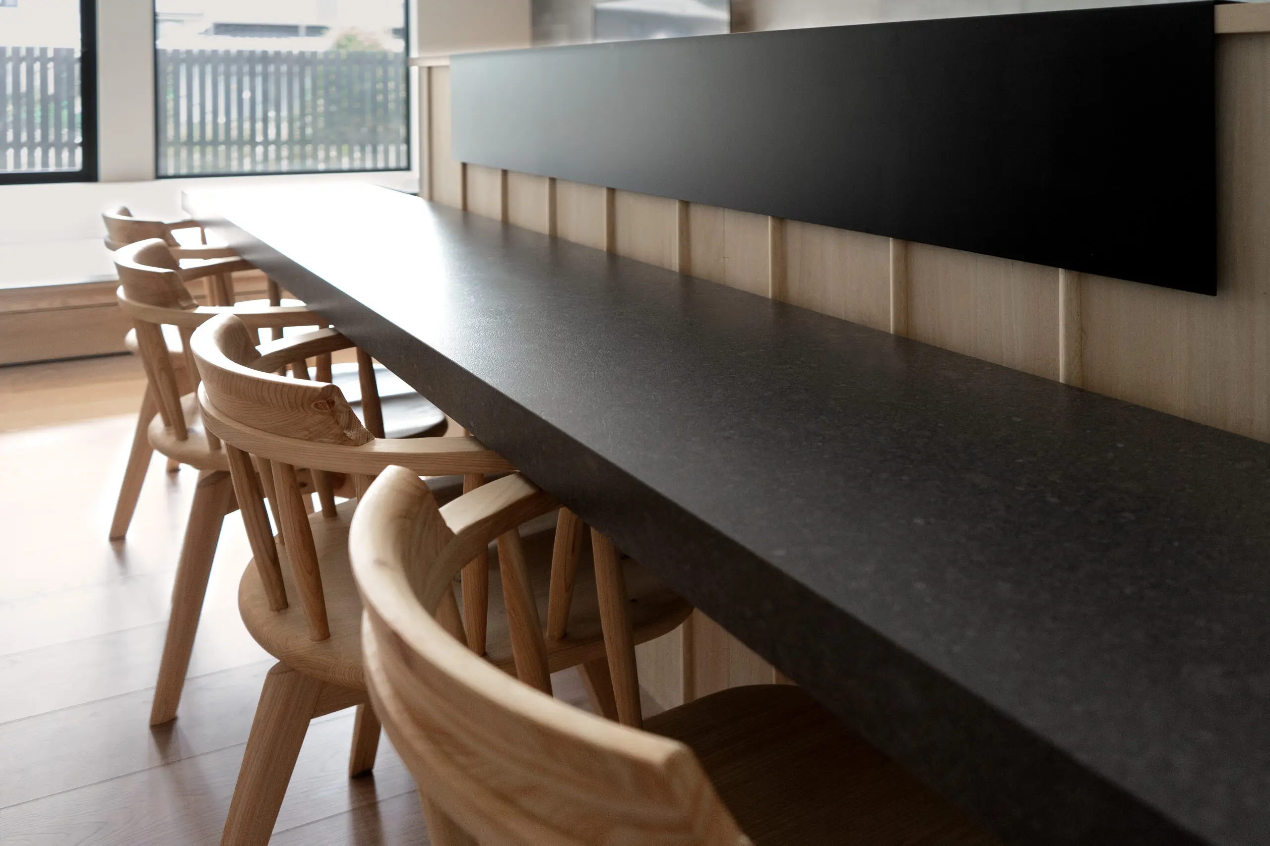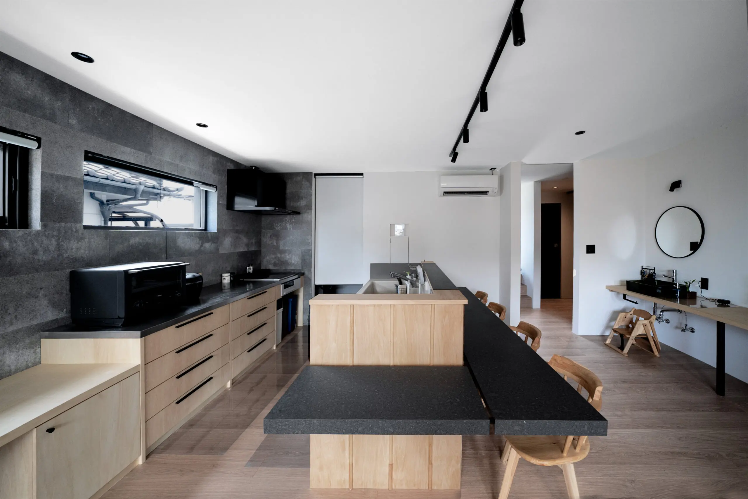 なるべく強い日陰を作らないよう、建物の大屋根は北側が水下になるよう片流れ屋根に。建物の配置も道路からのセットバックを短くし、なるべく北側に広く外からの目線を感じないプライベート空間を確保。北側リビングに隣接しテラスも設けた。日光を浴びて疲れた子供達が、川のせせらぎを感じながら屋根の下でひと休みする姿が想像できる。LDKのリビング部は一面を畳仕上げとし、段差もつけた。シンプルな空間にメリハリが生まれ、座卓を囲む姿がどこか懐かしさを感じさせる。床から天井まである窓からは、山々の季節の移り変わりを感じられ、目の前の庭で遊ぶ子供達を眺めながらリビングでくつろぐ時間は、この家族のライフスタイルには欠かせない要素と考えた。