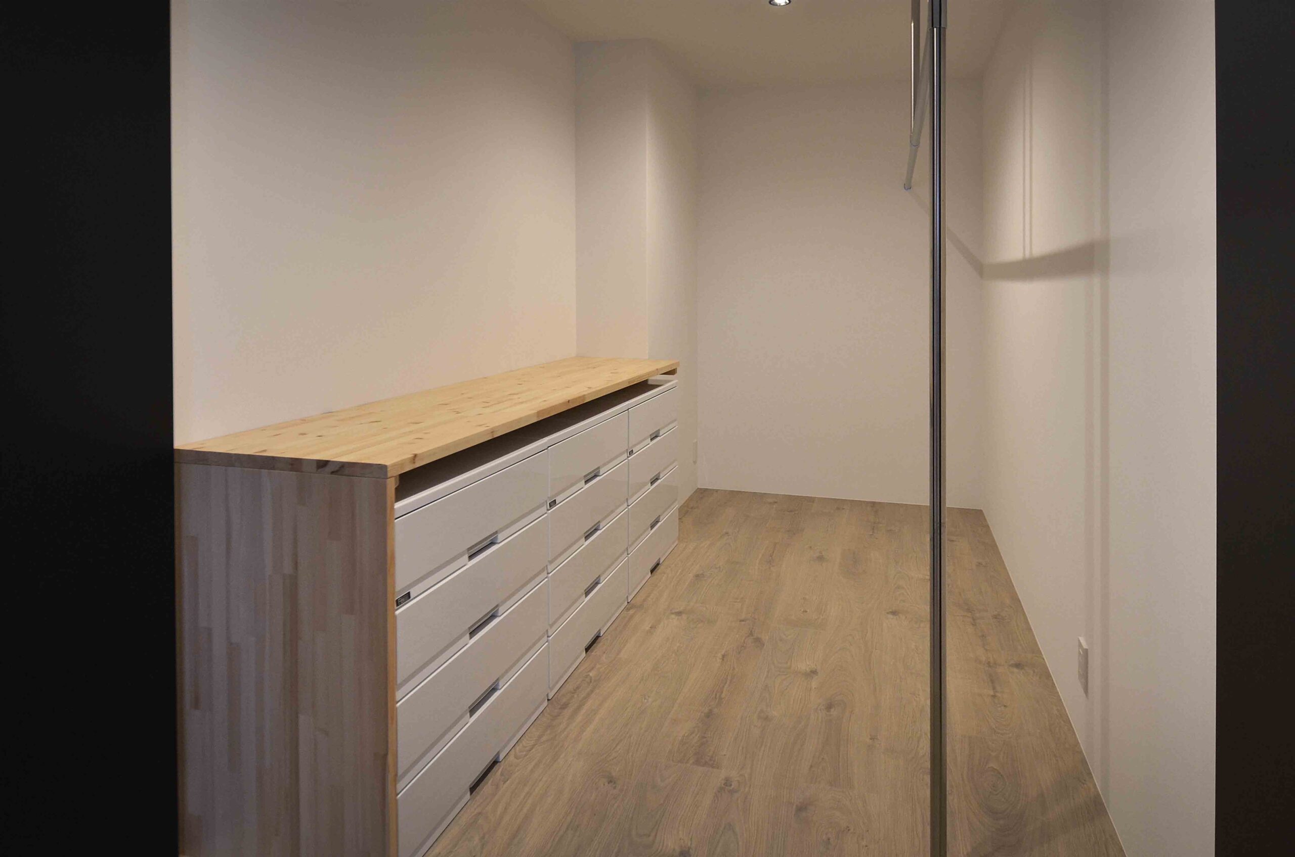 間取りの大きな特徴として6畳ほどの家事室をキッチンに接して配置。洗濯から室内干し、衣類の収納も他人に見られることなく展開できる設計。