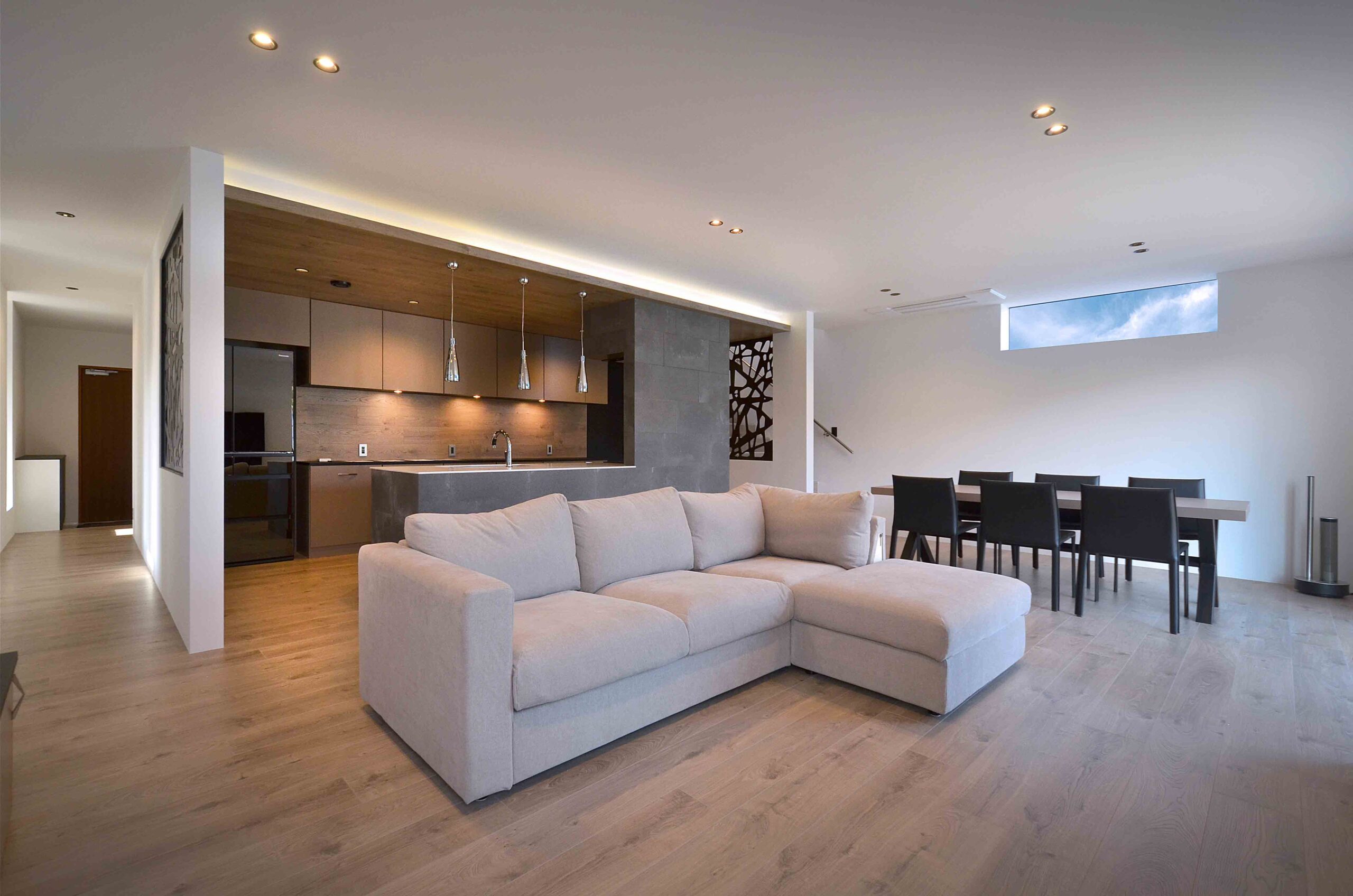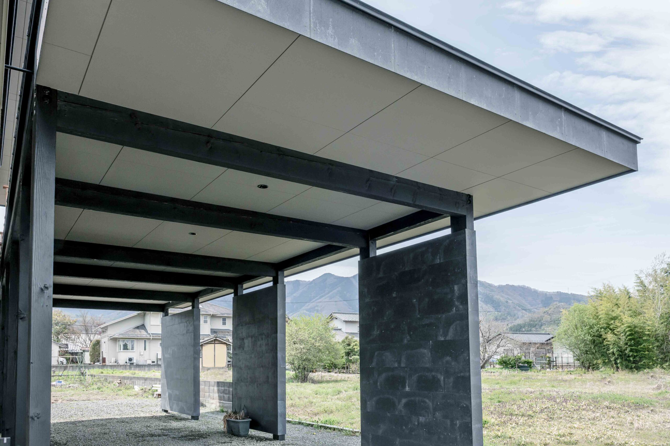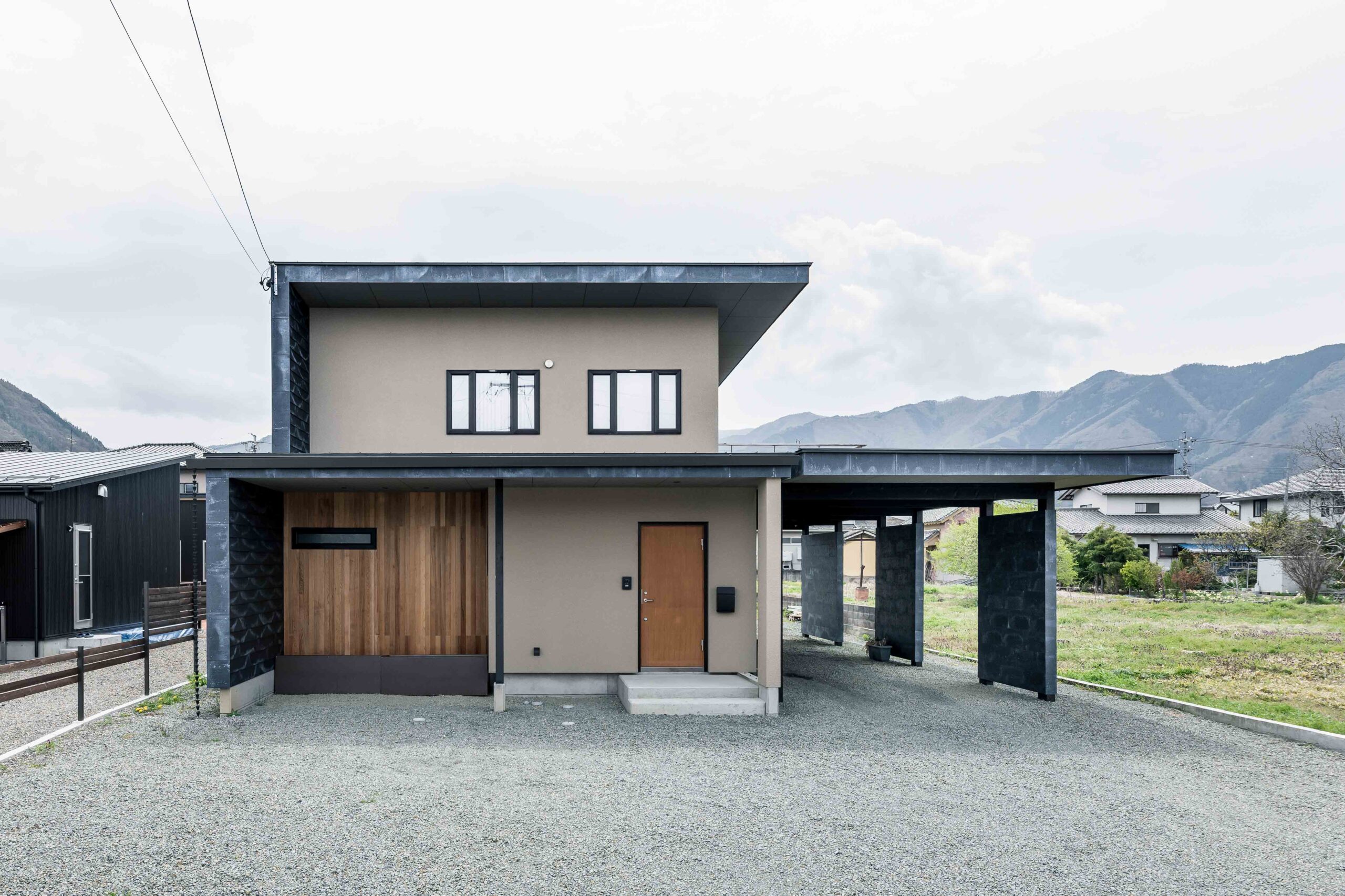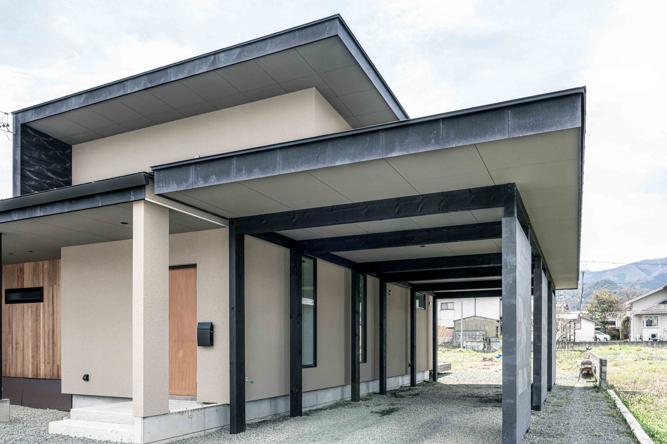 また住宅とカーポートを同じデザインにて建築したことにより、横への広がりをみせ建物の高さを抑えて魅せている。インテリアは魅せるところと魅せないところのギャップをきちんと作り生活感のないライフスタイルが送れるデザインにした。