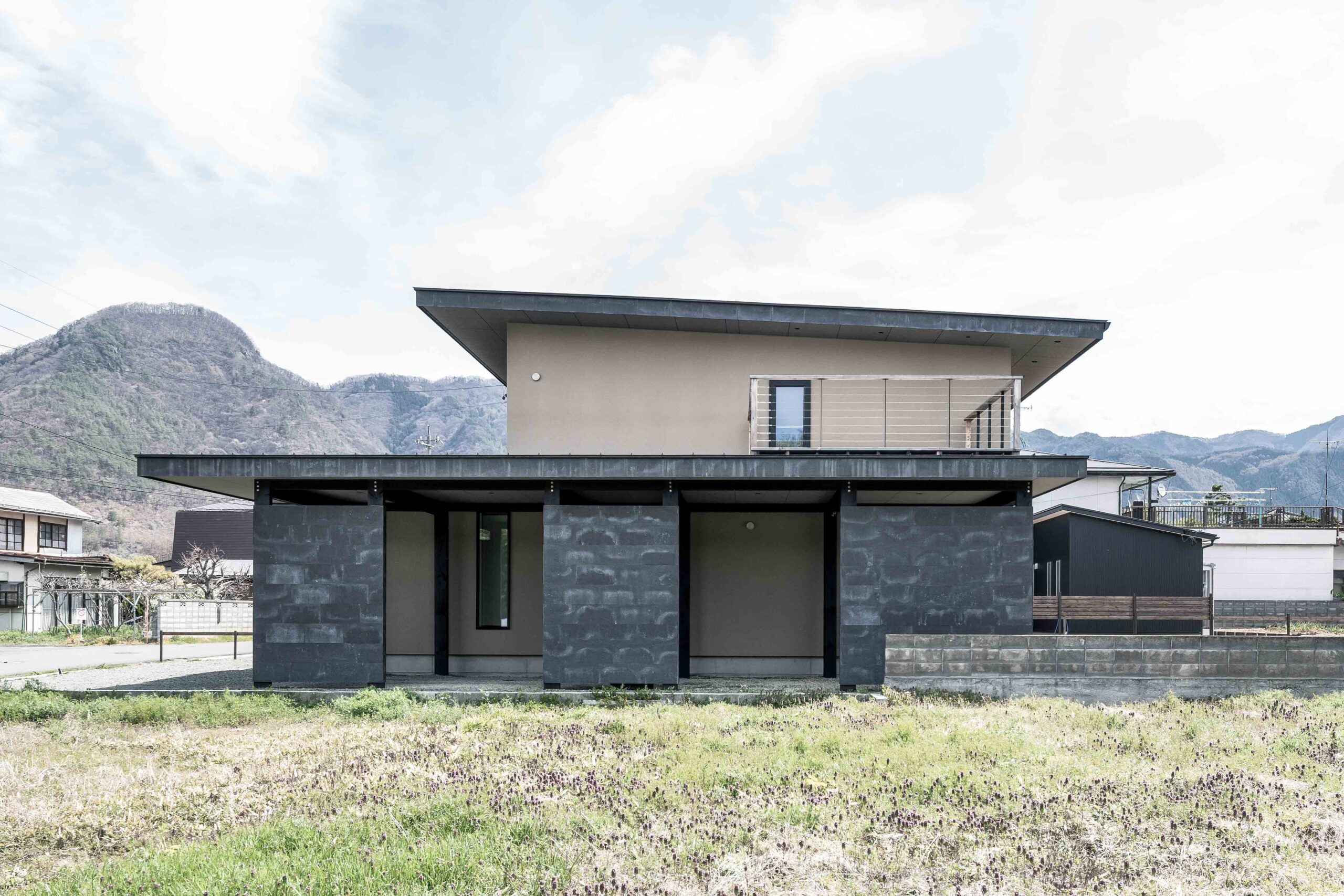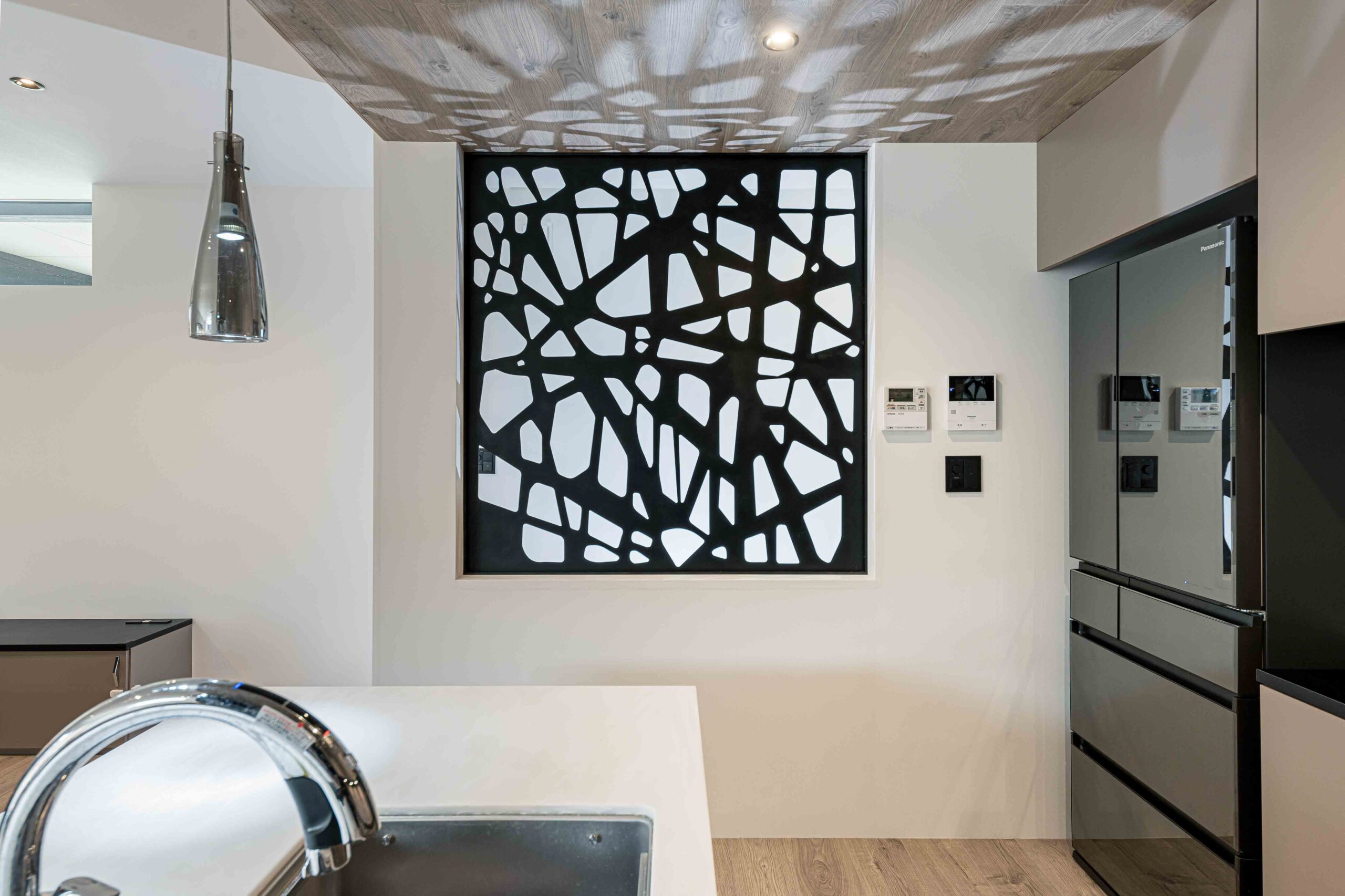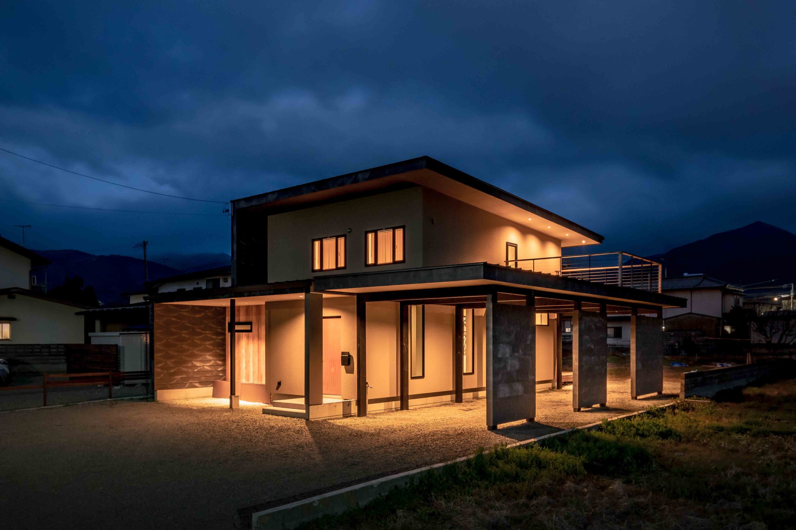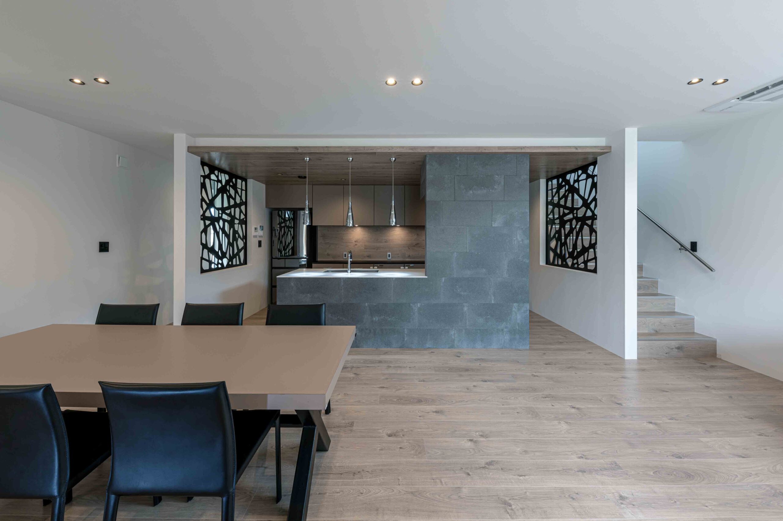 また住宅とカーポートを同じデザインにて建築したことにより、横への広がりをみせ建物の高さを抑えて魅せている。インテリアは魅せるところと魅せないところのギャップをきちんと作り生活感のないライフスタイルが送れるデザインにした。