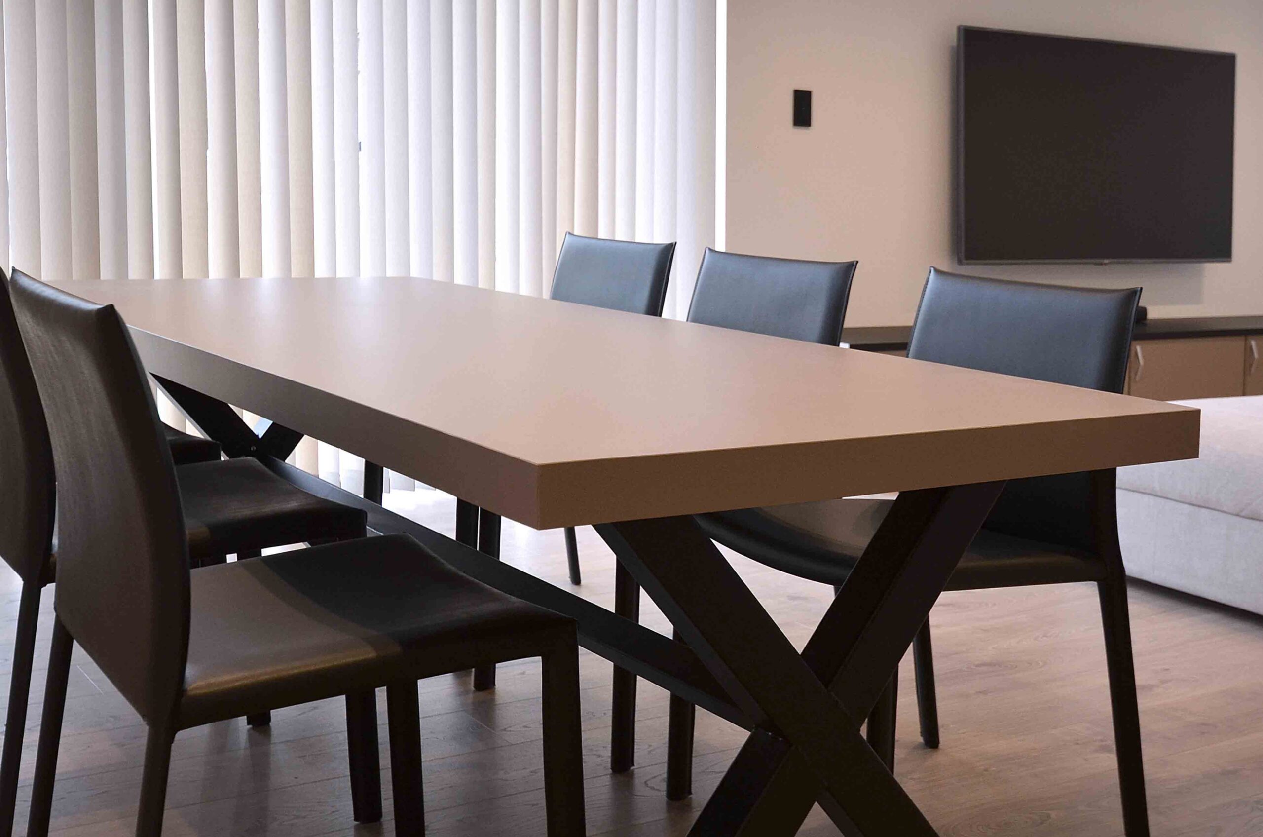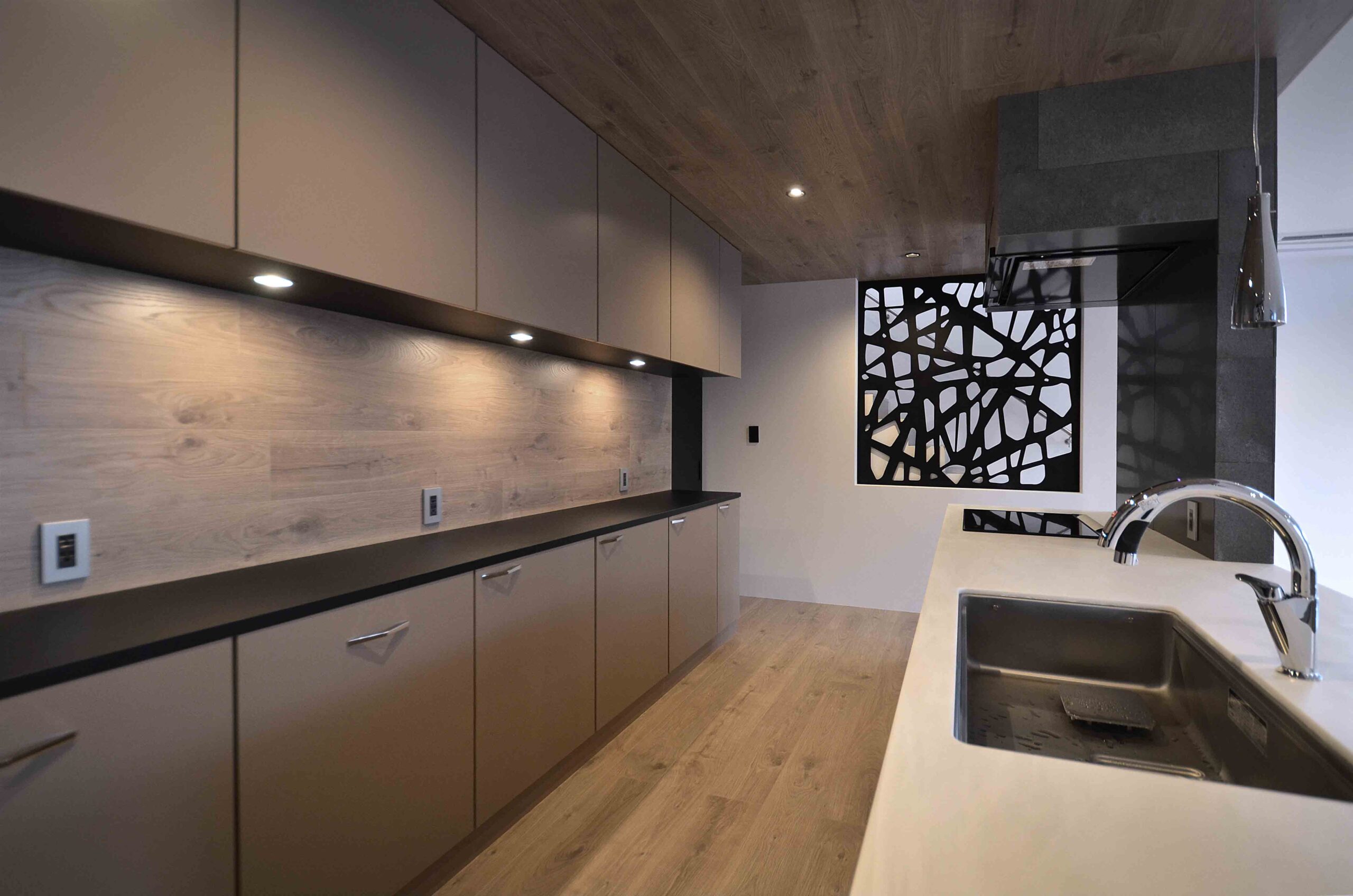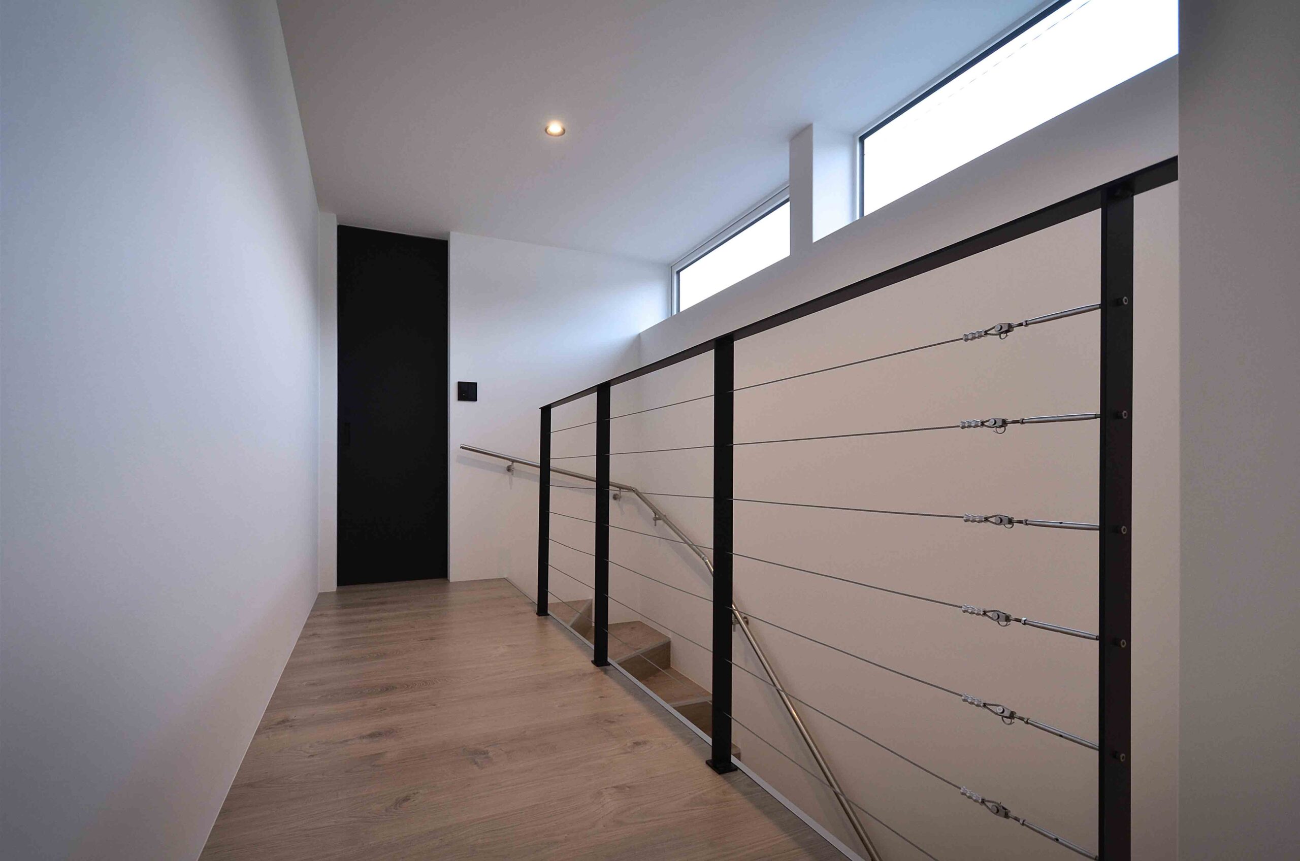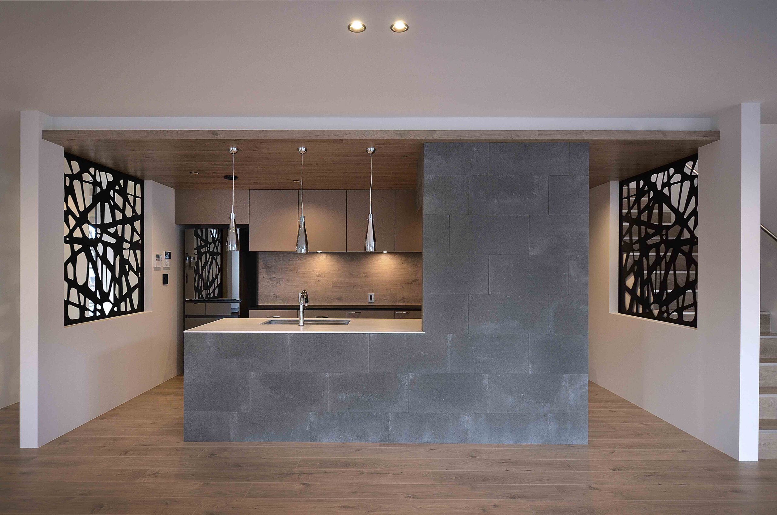 また住宅とカーポートを同じデザインにて建築したことにより、横への広がりをみせ建物の高さを抑えて魅せている。インテリアは魅せるところと魅せないところのギャップをきちんと作り生活感のないライフスタイルが送れるデザインにした。